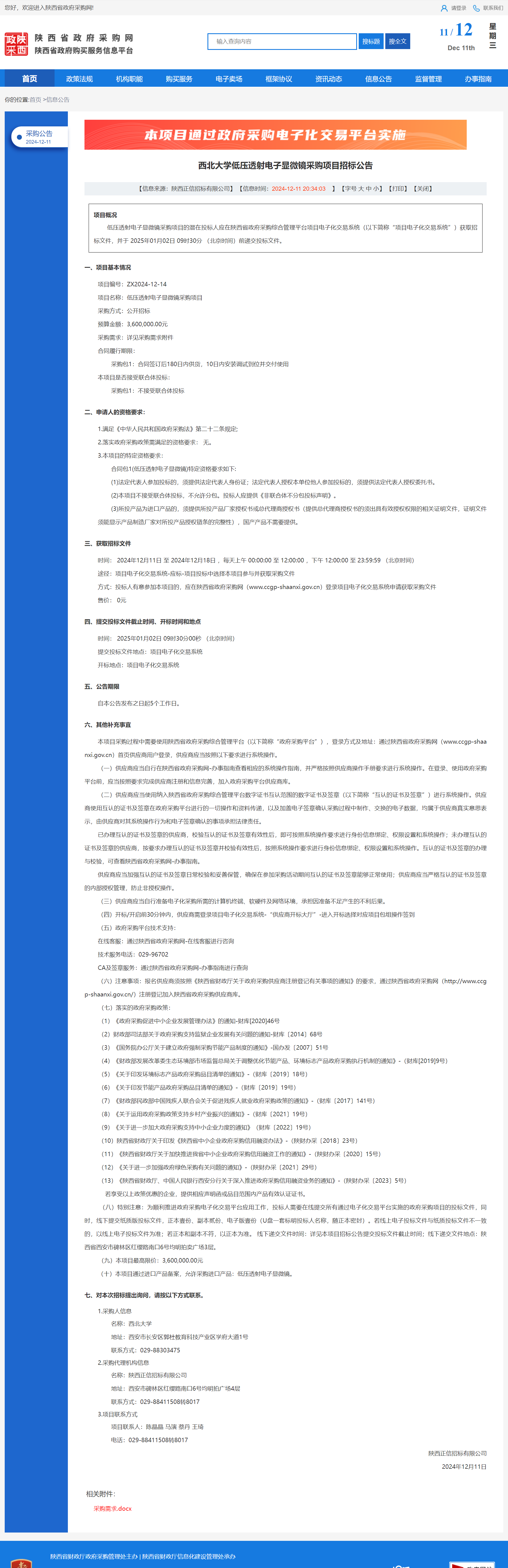 MILAN.COM低压透射电子显微镜采购项目招标公告 作者:采购与招标办公室 编辑: 时间:2024-12-11 原公告链接:https://www.ccgp-shaanxi.gov.cn/freecms/site/shaanxi/ggxx/info/2024/8a69c251921857370193b58a2eef18ef.html?noticeType=001011¬iceId=d31c6b03-b7bd-11ef-8063-08c0eb20c666