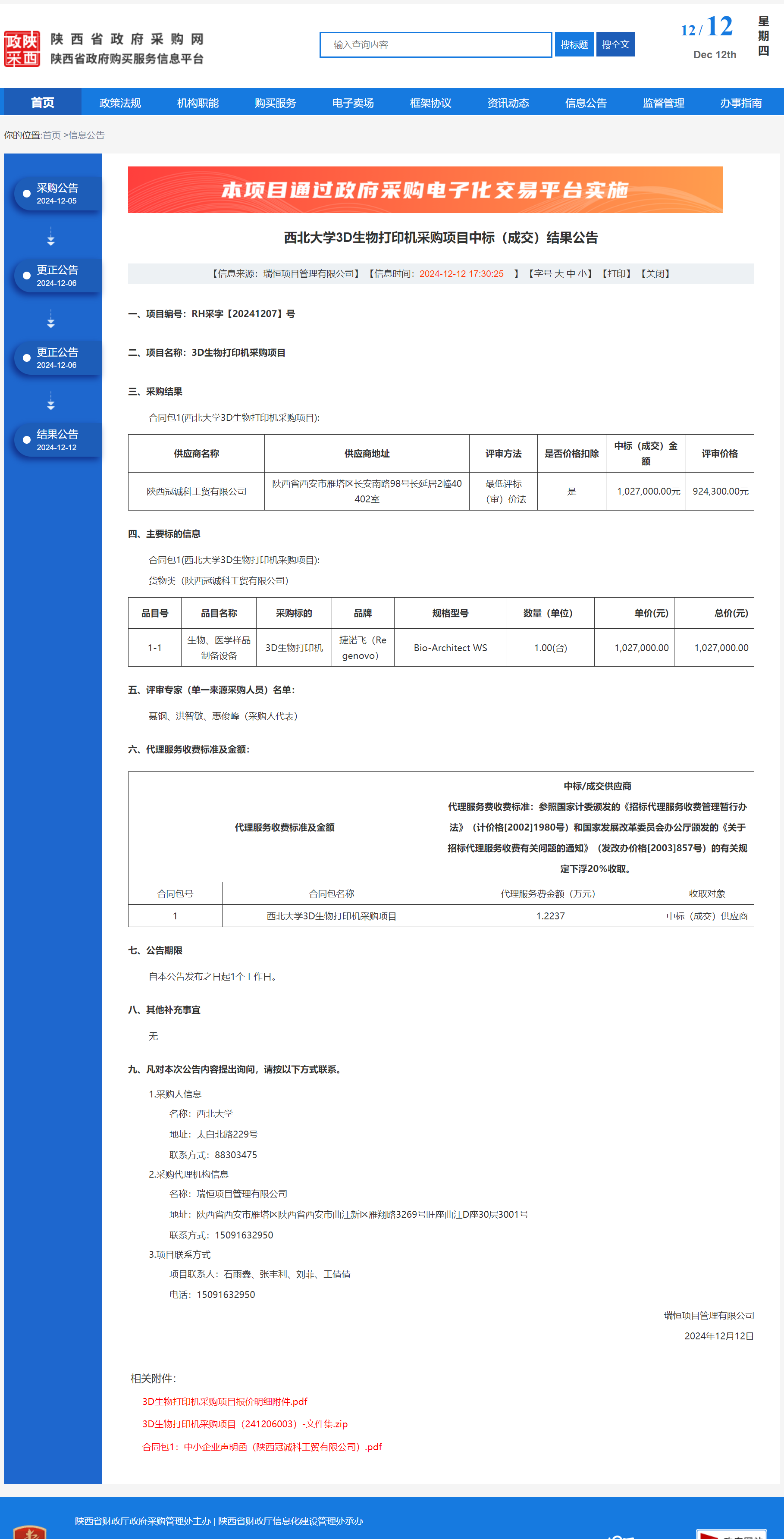 MILAN.COM3D生物打印机采购项目中标(成交)结果公告 作者:采购与招标办公室 编辑: 时间:2024-12-12 原公告链接:https://www.ccgp-shaanxi.gov.cn/freecms/site/shaanxi/ggxx/info/2024/8a69c95d921859f00193ba2d4fab4cb1.html