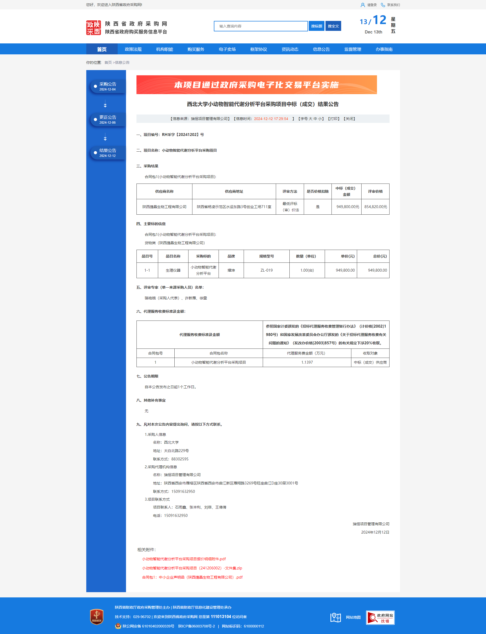 MILAN.COM小动物智能代谢分析平台采购项目中标(成交)结果公告