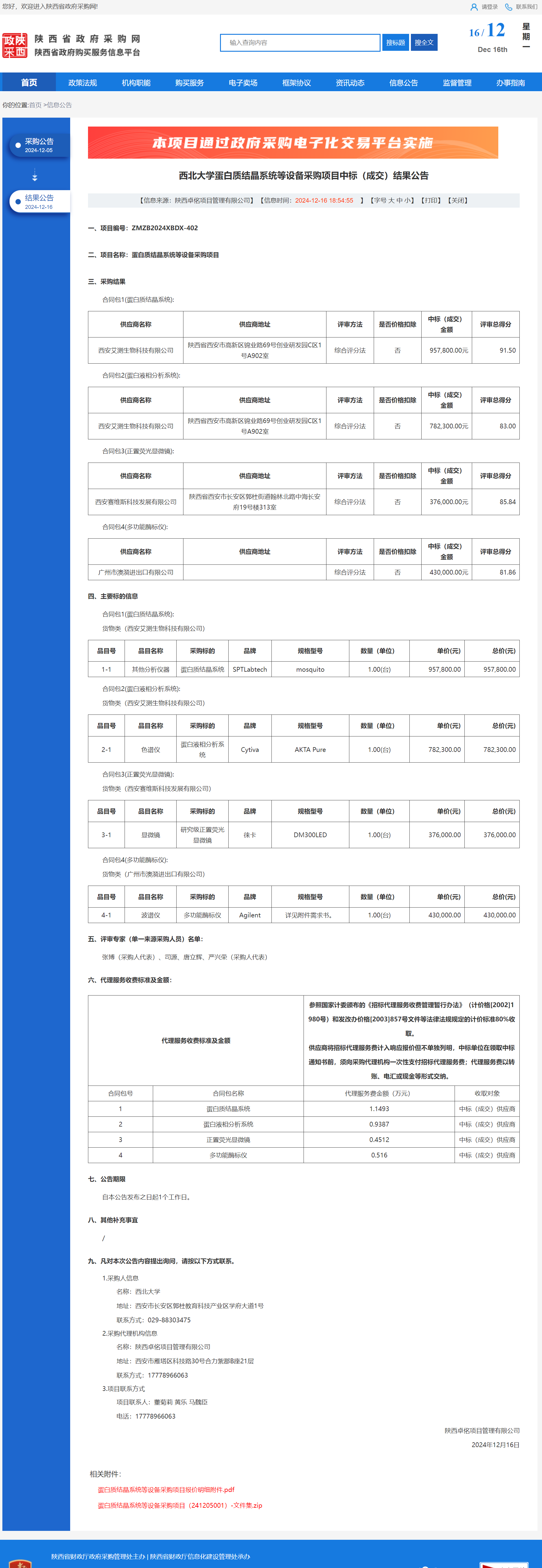 MILAN.COM蛋白质结晶系统等设备采购项目中标(成交)结果公告 作者:采购与招标办公室 编辑: 时间:2024-12-16 原公告链接:https://www.ccgp-shaanxi.gov.cn/freecms/site/shaanxi/ggxx/info/2024/8a69c44e9218572b0193ceff0acd011a.html?noticeType=001026¬iceId=d060c4f8-bb9d-11ef-8063-08c0eb20c666
