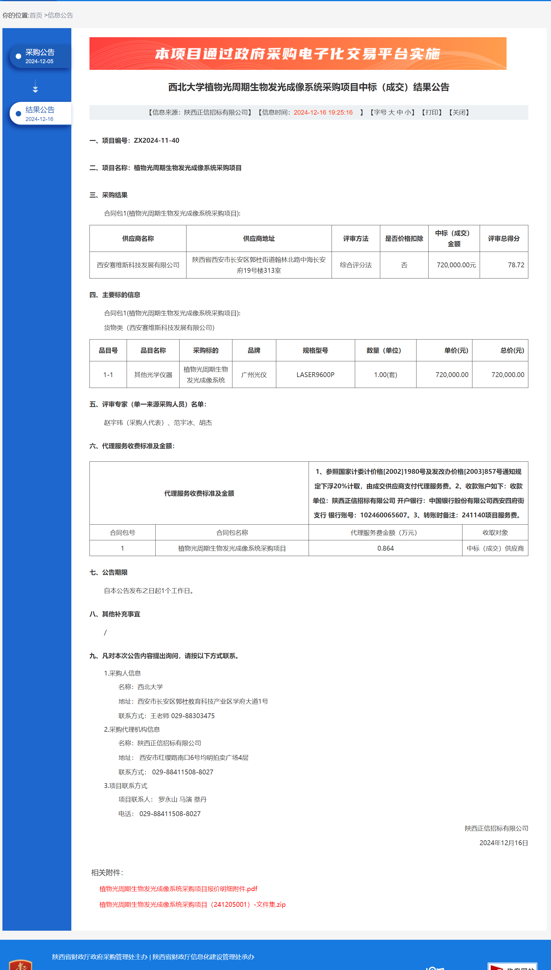 MILAN.COM植物光周期生物发光成像系统采购项目中标(成交)结果公告 作者:采购与招标办公室 编辑: 时间:2024-12-16 原公告链接:https://www.ccgp-shaanxi.gov.cn/freecms/site/shaanxi/ggxx/info/2024/8a69c5a59218576d0193cef8b9930b54.html?noticeType=001026¬iceId=0da826aa-bba2-11ef-8063-08c0eb20c666
