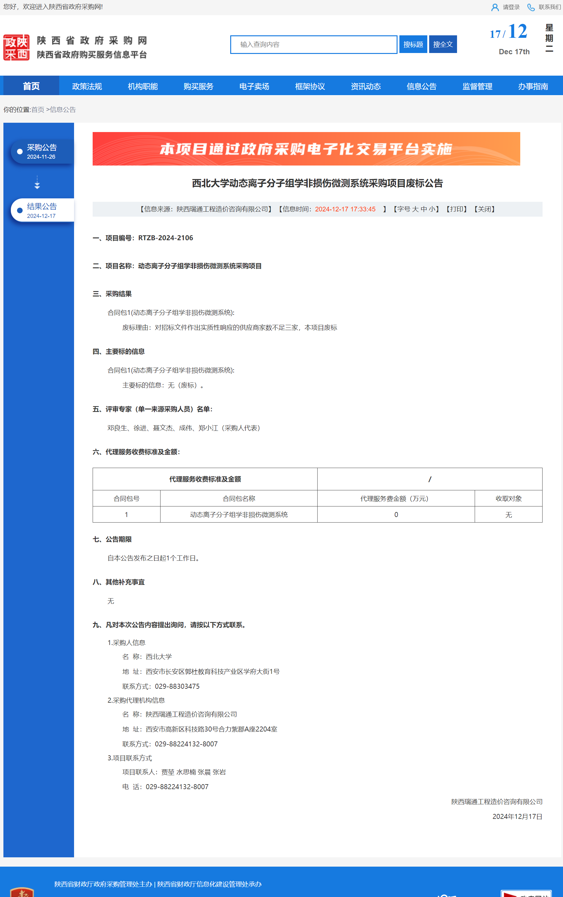 MILAN.COM动态离子分子组学非损伤微测系统采购项目废标公告 作者:采购与招标办公室 编辑: 时间:2024-12-17 原公告链接:http://www.ccgp-shaanxi.gov.cn/freecms/site/shaanxi/ggxx/info/2024/8a69c5a59218576d0193d3ef8a485b79.html?noticeType=001006¬iceId=a477f0fe-bc5b-11ef-8063-08c0eb20c666