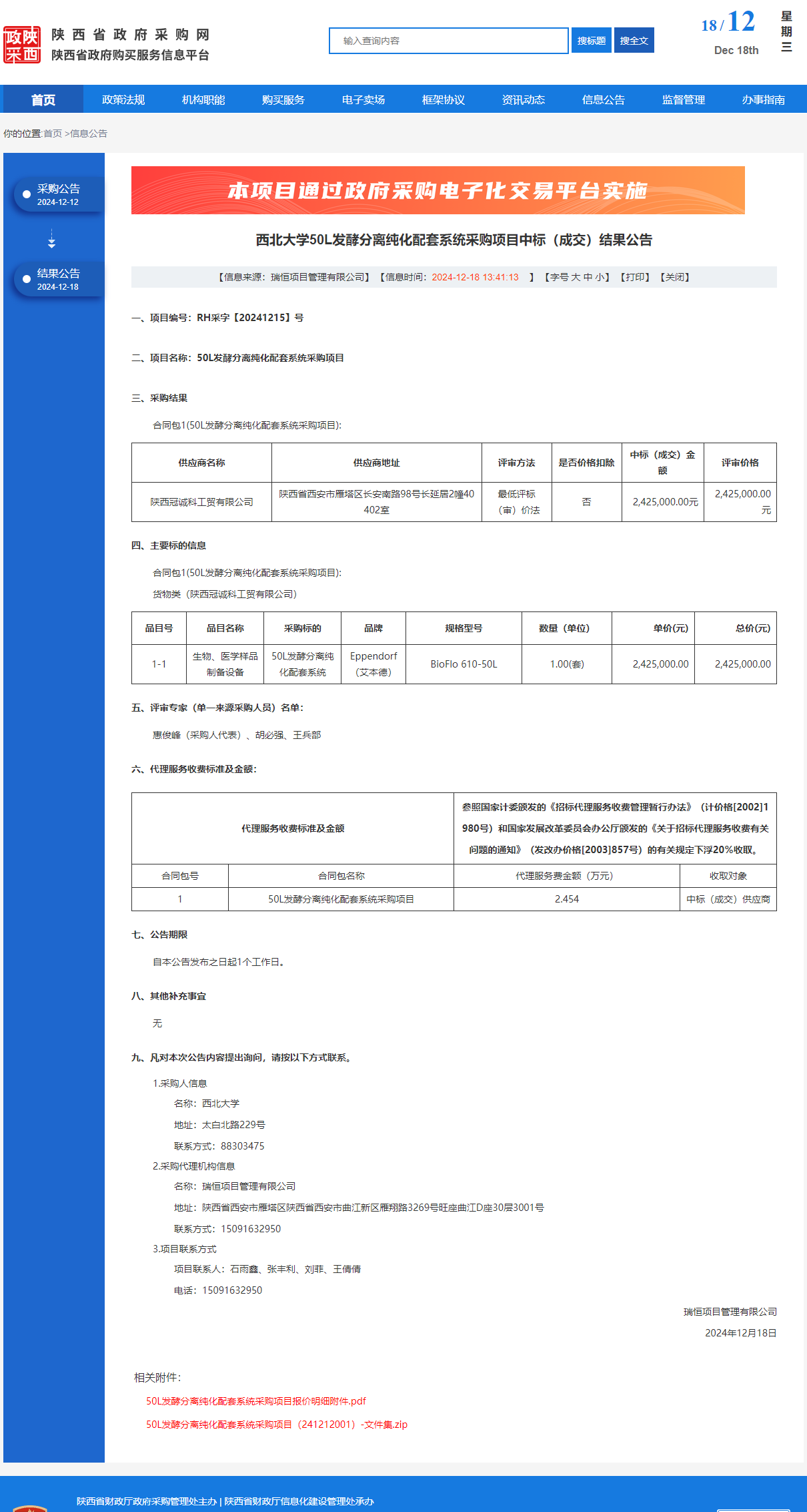 MILAN.COM50L发酵分离纯化配套系统采购项目中标(成交)结果公告 作者:采购与招标办公室 编辑: 时间:2024-12-18 原公告链接:https://www.ccgp-shaanxi.gov.cn/freecms/site/shaanxi/ggxx/info/2024/8a69c5a59218576d0193d83e10003654.html