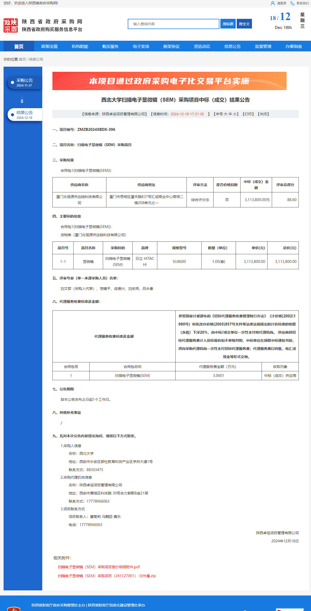 MILAN.COM扫描电子显微镜(SEM)采购项目中标(成交)结果公告 作者:采购与招标办公室 编辑: 时间:2024-12-18 原公告链接:https://www.ccgp-shaanxi.gov.cn/freecms/site/shaanxi/ggxx/info/2024/8a69c95d921859f00193d90183470ad8.html?noticeType=001021¬iceId=1e709926-bd23-11ef-8063-08c0eb20c666