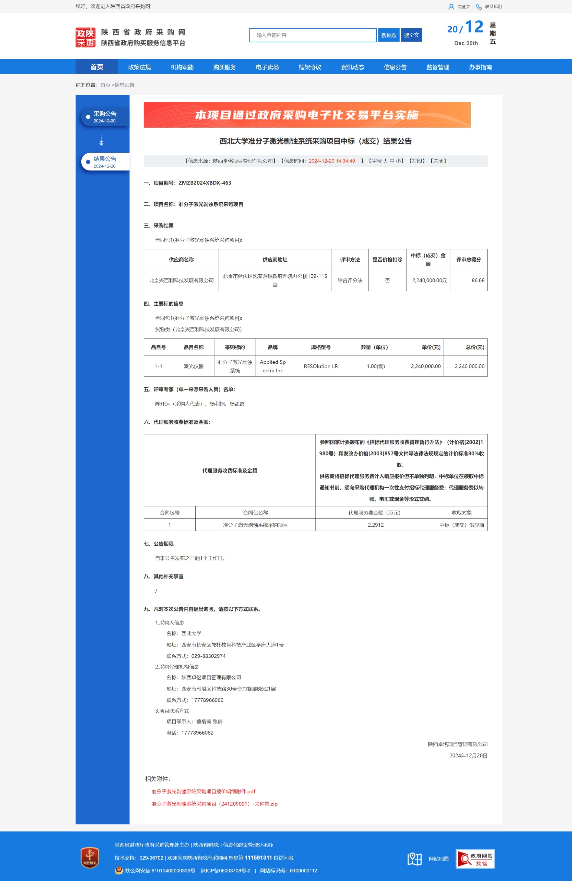 MILAN.COM准分子激光剥蚀系统采购项目中标(成交)结果公告 作者: 编辑:薛利娟 时间:2024-12-20 原 原公告链接:https://www.ccgp-shaanxi.gov.cn/freecms/site/shaanxi/ggxx/info/2024/8a69c44e9218572b0193e29f87ef1ad0.html?noticeType=001026¬iceId=25ebb152-be9e-11ef-8063-08c0eb20c666