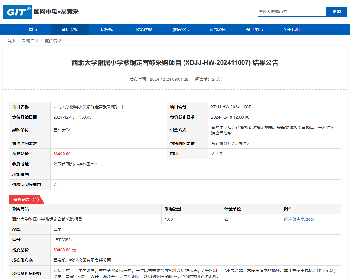 MILAN.COM附属小学紫铜定音鼓采购项目(XDJJ-HW-202411007)竞价结果公告 作者:采购与招标办公室 编辑: 时间:2024-12-24 原公告链接:https://www.ejingcai.com.cn/site/bidding/detail/16145