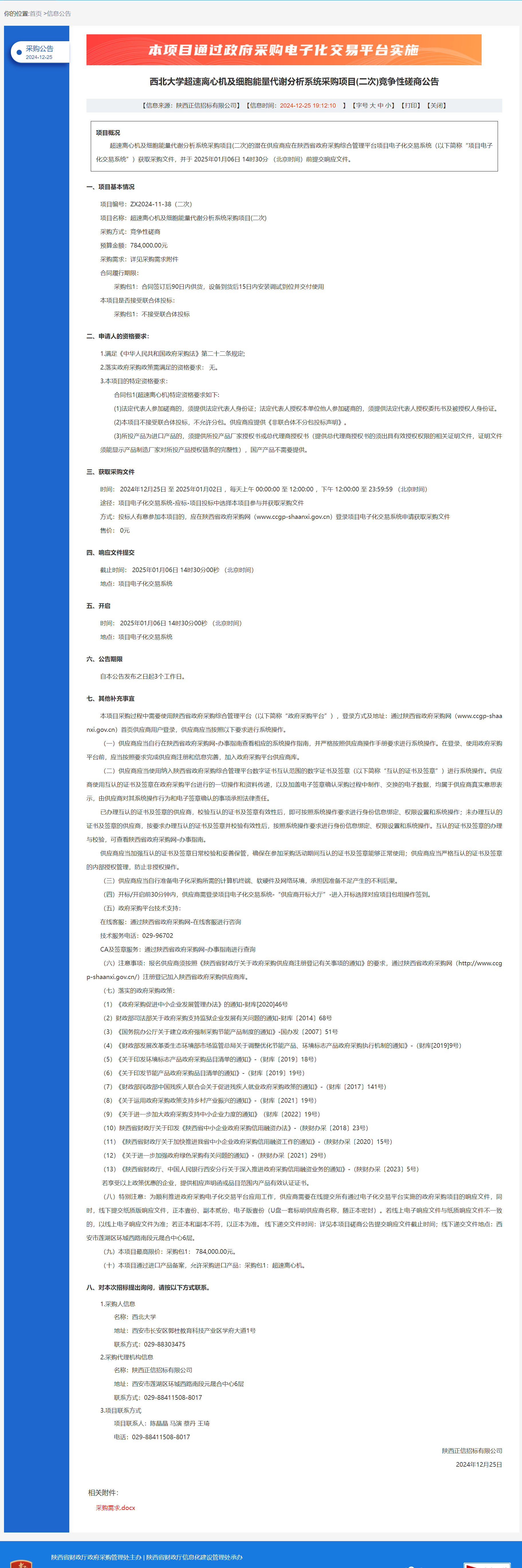 MILAN.COM超速离心机及细胞能量代谢分析系统采购项目(二次)竞争性磋商公告 作者:采购与招标办公室 编辑: 时间:2024-12-25 原公告链接:https://www.ccgp-shaanxi.gov.cn/freecms/site/shaanxi/ggxx/info/2024/8a69c44e9218572b0193fd6e7f5f4622.html?noticeType=001016¬iceId=bb6eaae2-c2b2-11ef-8063-08c0eb20c666