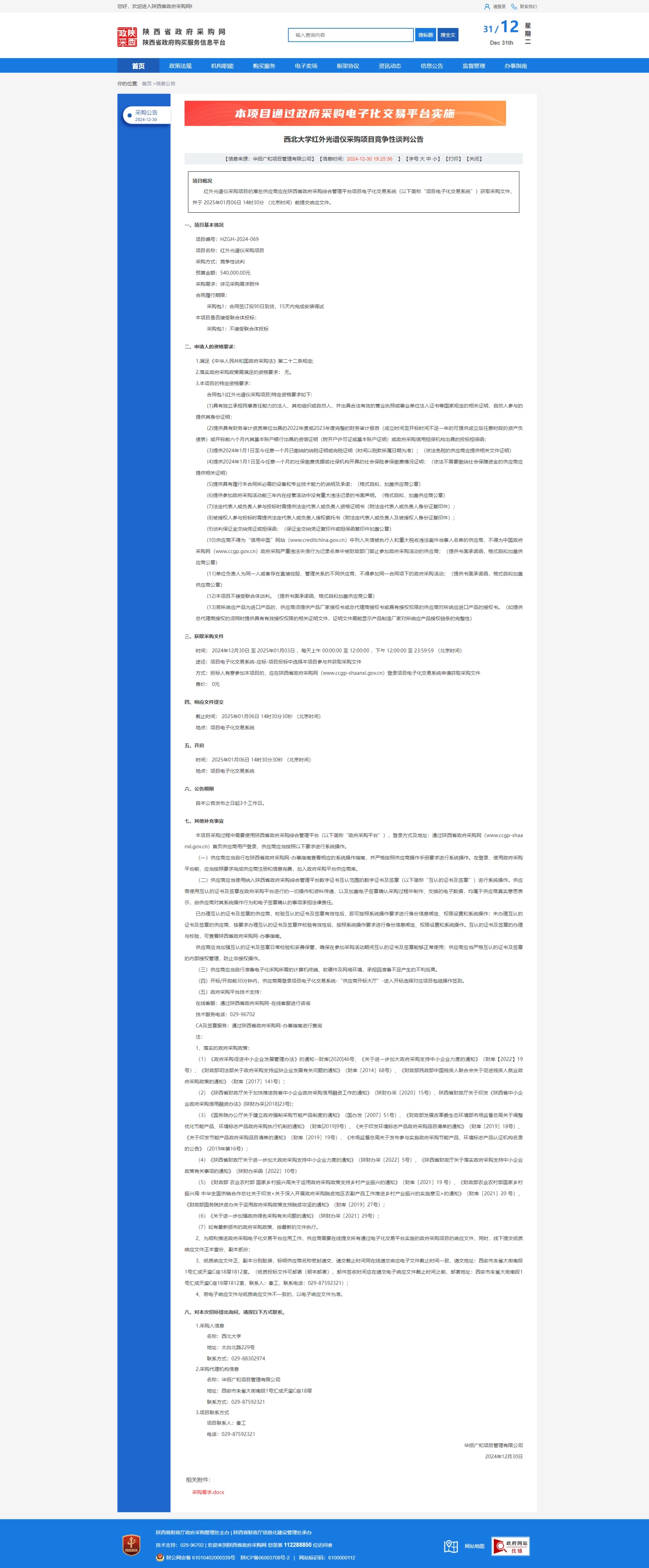 MILAN.COM红外光谱仪采购项目竞争性谈判公告 作者: 编辑:薛利娟 时间:2024-12-31 原公告链接:https://www.ccgp-shaanxi.gov.cn/freecms/site/shaanxi/ggxx/info/2024/8a69c251921857370194174168cb49b9.html?noticeType=001013¬iceId=7e09294d-c6a2-11ef-8063-08c0eb20c666