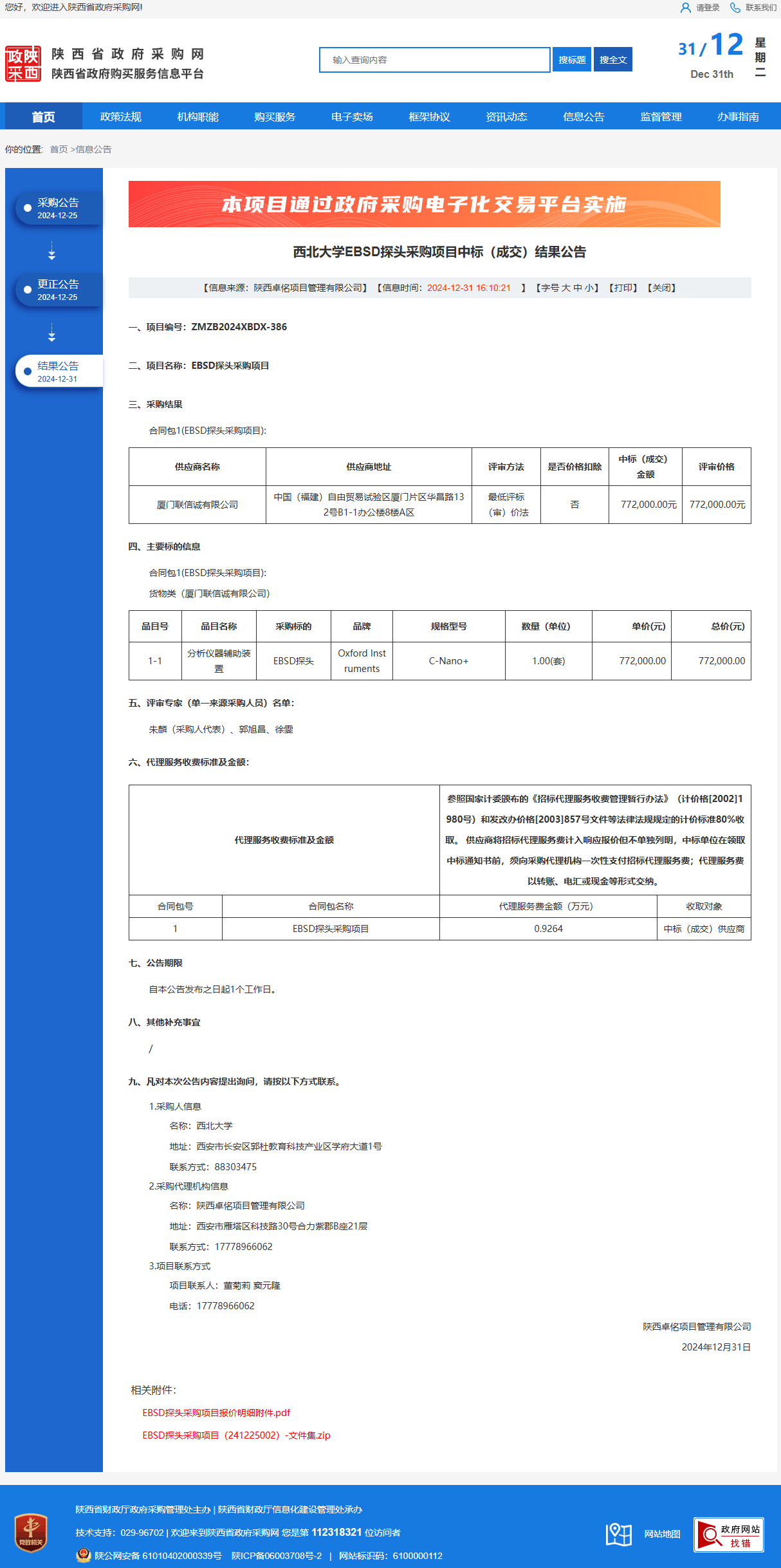 MILAN.COMEBSD探头采购项目中标(成交)结果公告 作者:采购与招标办公室 编辑: 时间:2024-12-31 原公告链接:https://www.ccgp-shaanxi.gov.cn/freecms/site/shaanxi/ggxx/info/2024/8a69c44e9218572b01941bbf3cfd0e2a.html?noticeType=001023¬iceId=56151531-c750-11ef-8063-08c0eb20c666