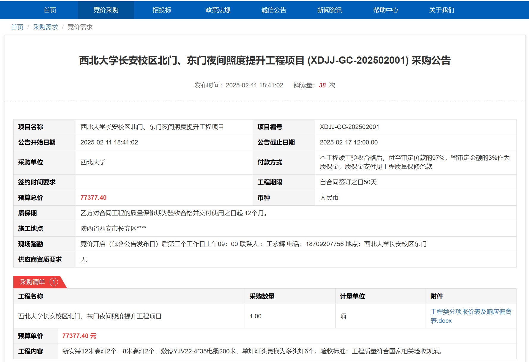 MILAN.COM长安校区北门、东门夜间照度提升工程项目(XDJJ-GC-202502001)竞价采购公告 作者:采购与招标办公室 编辑: 时间:2025-02-11 原公告链接:https://www.ejingcai.com.cn/site/bidding/detail/16497