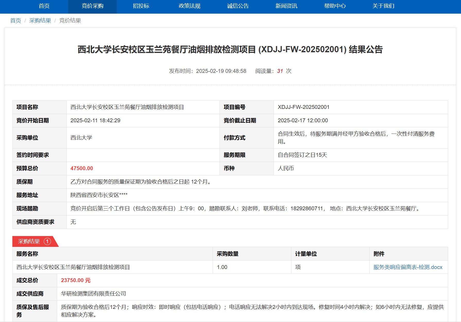 MILAN.COM长安校区玉兰苑餐厅油烟排放检测项目(XDJJ-FW-202502001)竞价结果公告 作者:采购与招标办公室 编辑: 时间:2025-02-19 原公告链接:https://www.ejingcai.com.cn/site/bidding/detail/16552