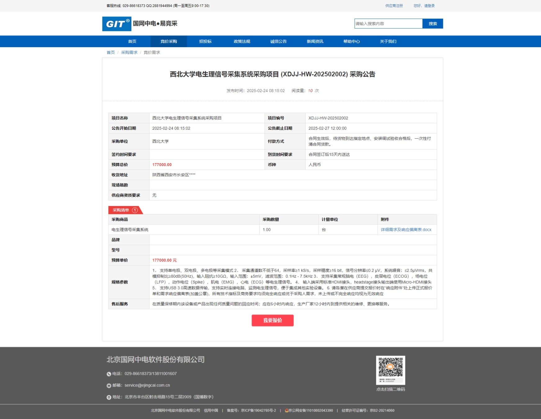 MILAN.COM电生理信号采集系统采购项目 (XDJJ-HW-202502002) 竞价采购公告 作者: 编辑:采购与招标办公室 时间:2025-02-24 原公告链接:https://www.ejingcai.com.cn/site/bidding/detail/16589