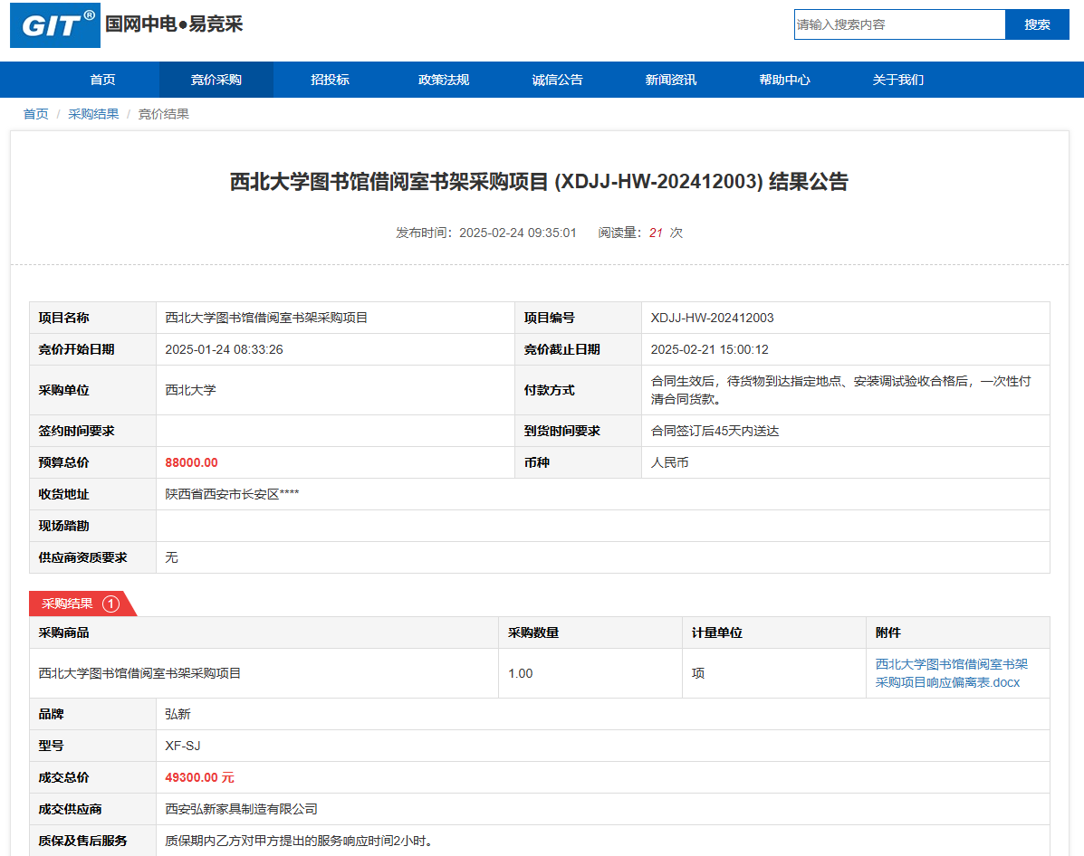 MILAN.COM图书馆借阅室书架采购项目(XDJJ-HW-202412003)竞价结果公告 作者:采购与招标办公室 编辑: 时间:2025-02-24 原公告链接:https://www.ejingcai.com.cn/site/bidding/detail/16596