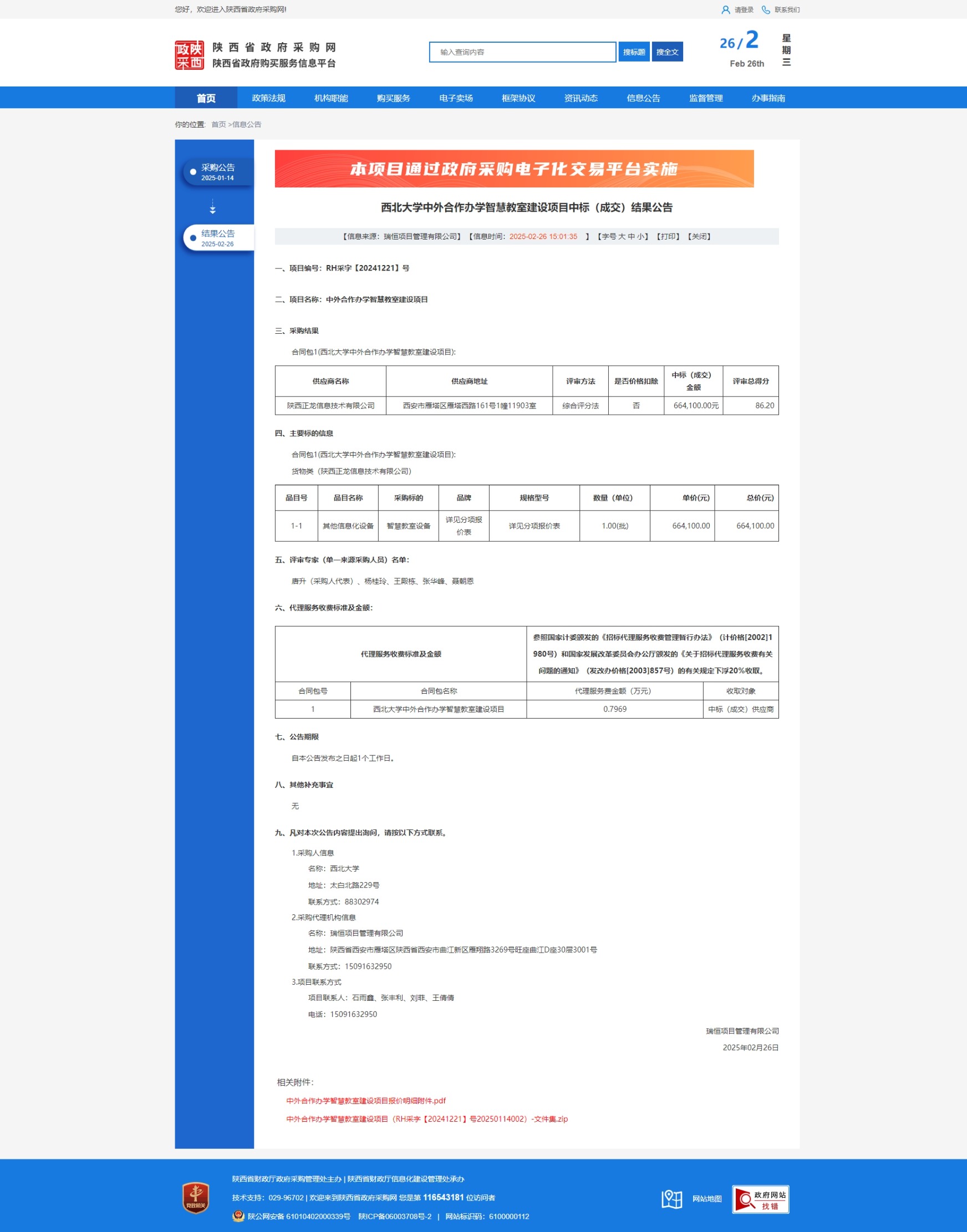 MILAN.COM中外合作办学智慧教室建设项目中标(成交)结果公告 作者: 编辑:采购与招标办公室 时间:2025-02-26 原公告链接:https://www.ccgp-shaanxi.gov.cn/freecms/site/shaanxi/ggxx/info/2025/8a69c07394fffbb3019540f217e8256e.html?noticeType=001021¬iceId=47d2d283-f411-11ef-8063-08c0eb20c666