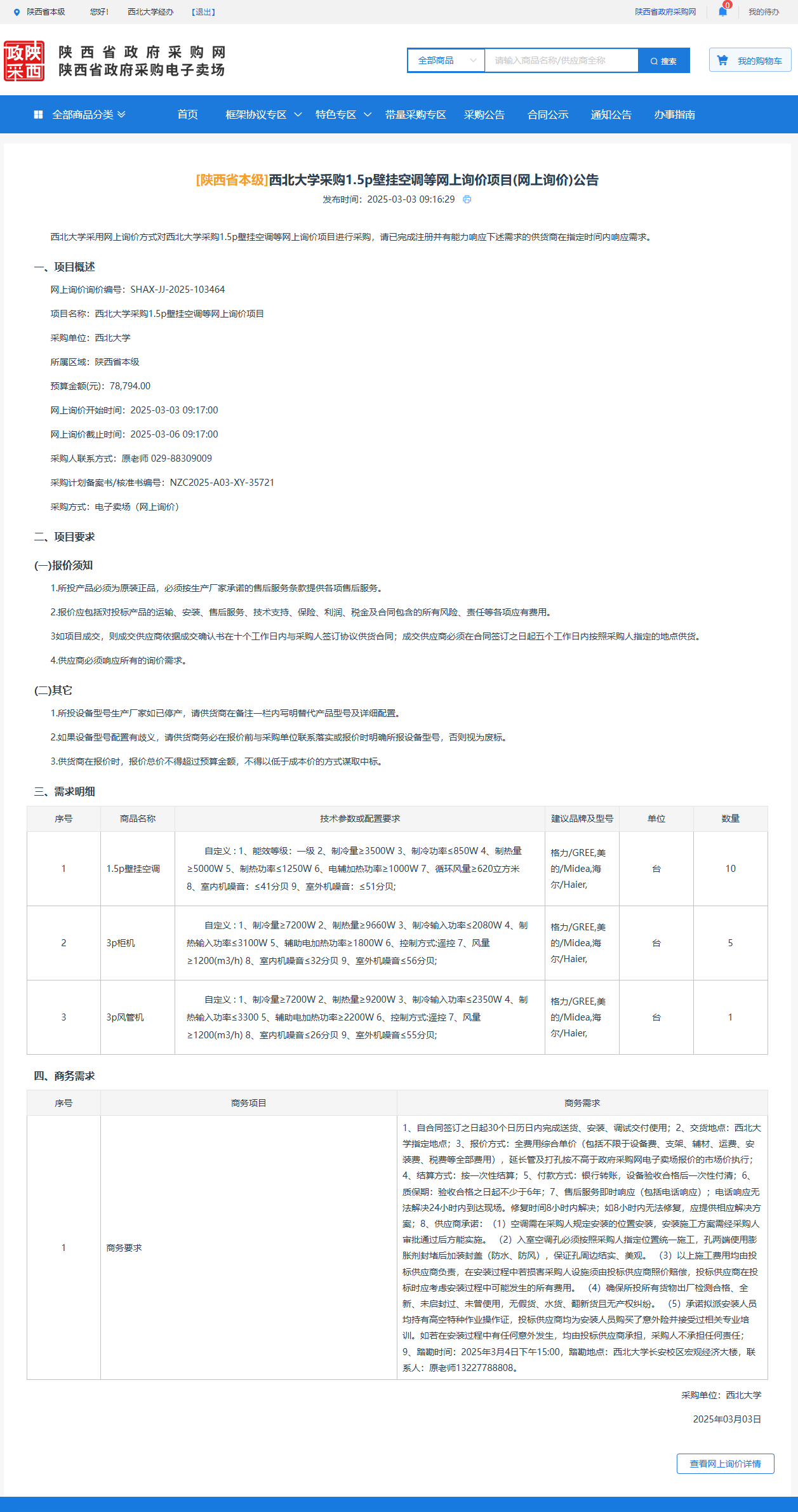 MILAN.COM采购1.5p壁挂空调等网上询价项目(网上询价)公告 作者:采购与招标办公室 编辑: 时间:2025-03-03 原公告链接:https://www.ccgp-shaanxi.gov.cn/gpmall-main-web/basic/noticeDetail?noticeGuid=7295516810999431168