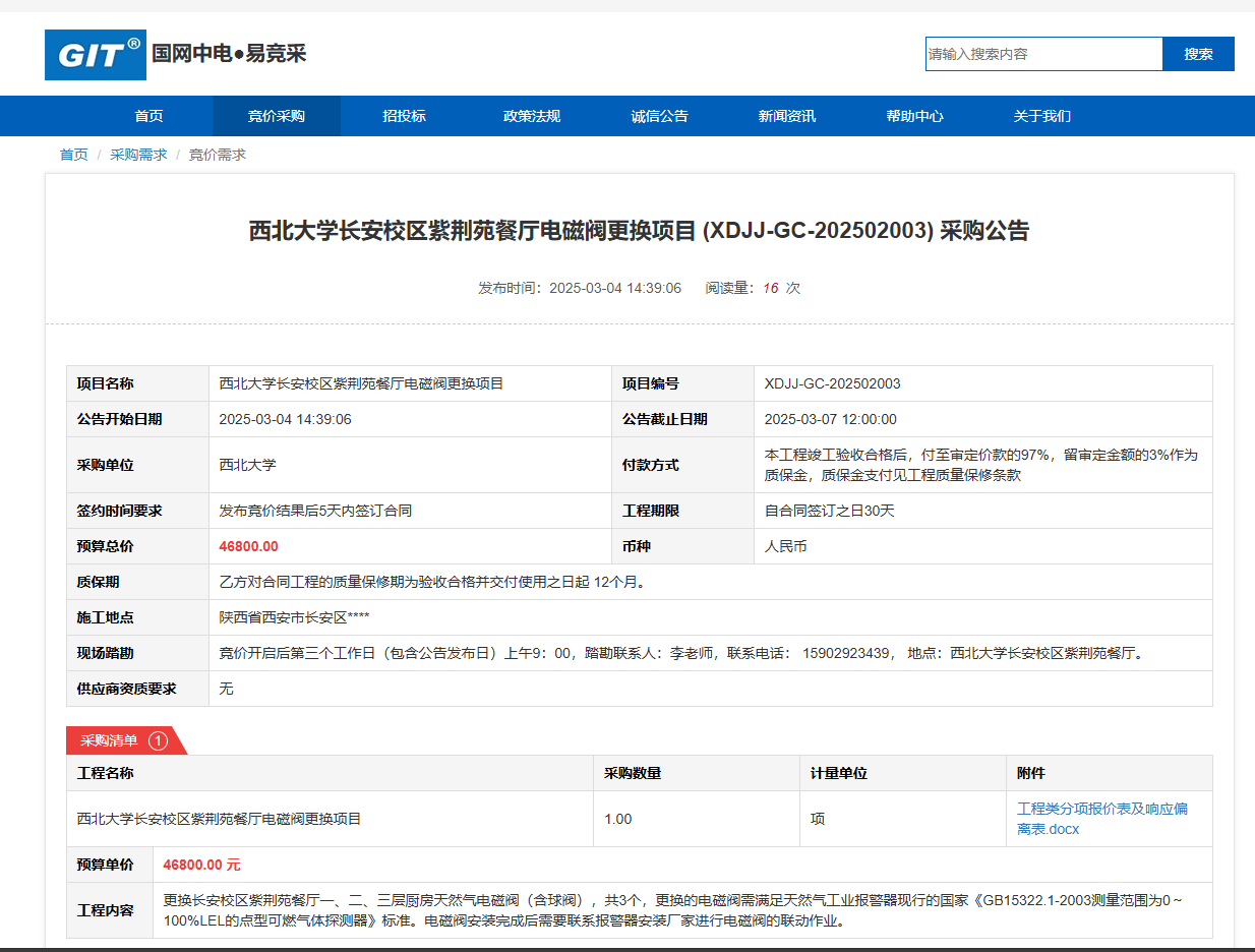 MILAN.COM长安校区紫荆苑餐厅电磁阀更换项目(XDJJ-GC-202502003)竞价采购公告 作者:采购与招标办公室 编辑: 时间:2025-03-04 原公告链接:https://www.ejingcai.com.cn/site/bidding/detail/16712
