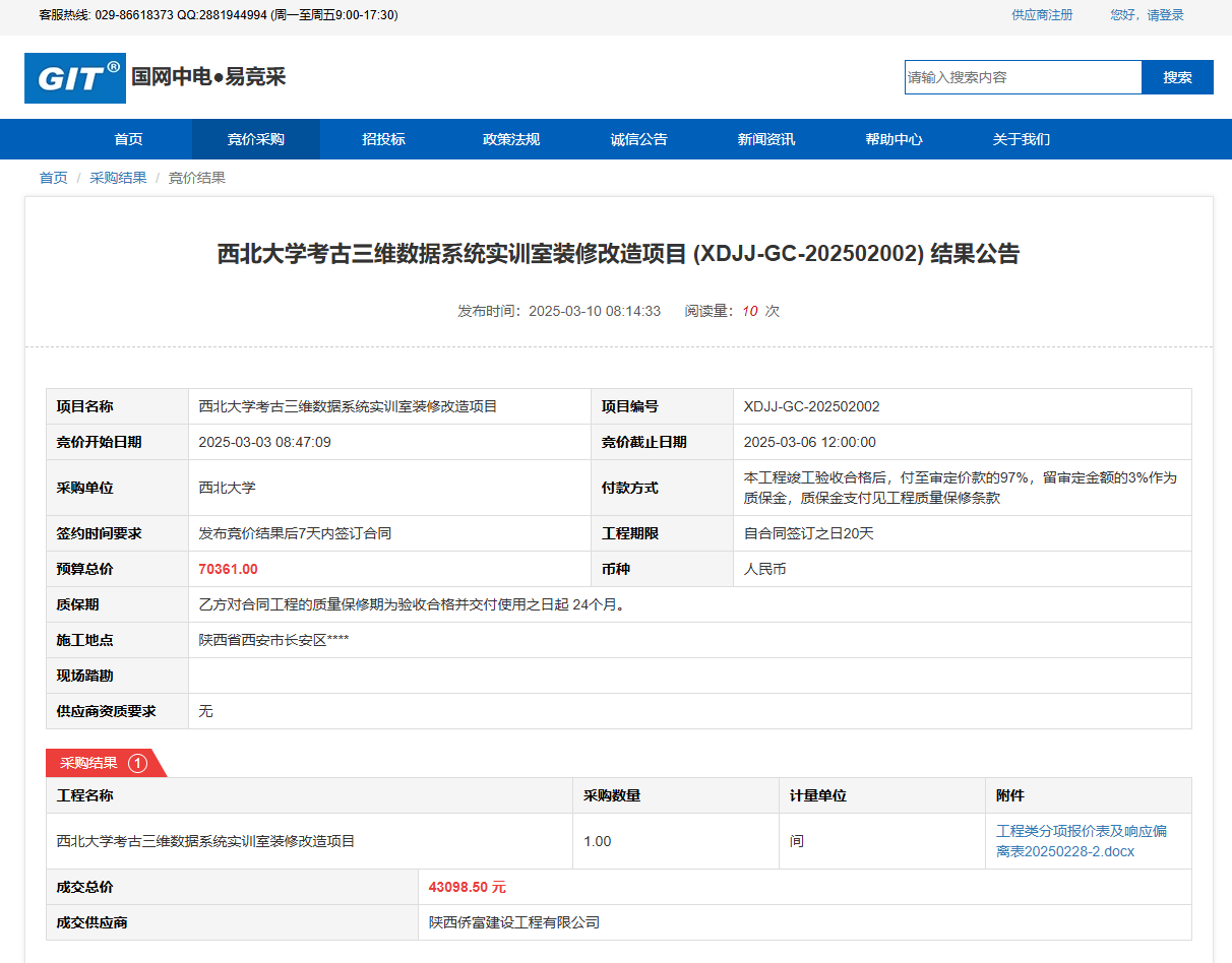 MILAN.COM考古三维数据系统实训室装修改造项目(XDJJ-GC-202502002)竞价结果公告 作者:采购与招标办公室 编辑: 时间:2025-03-10 原公告链接:https://www.ejingcai.com.cn/site/bidding/detail/16795