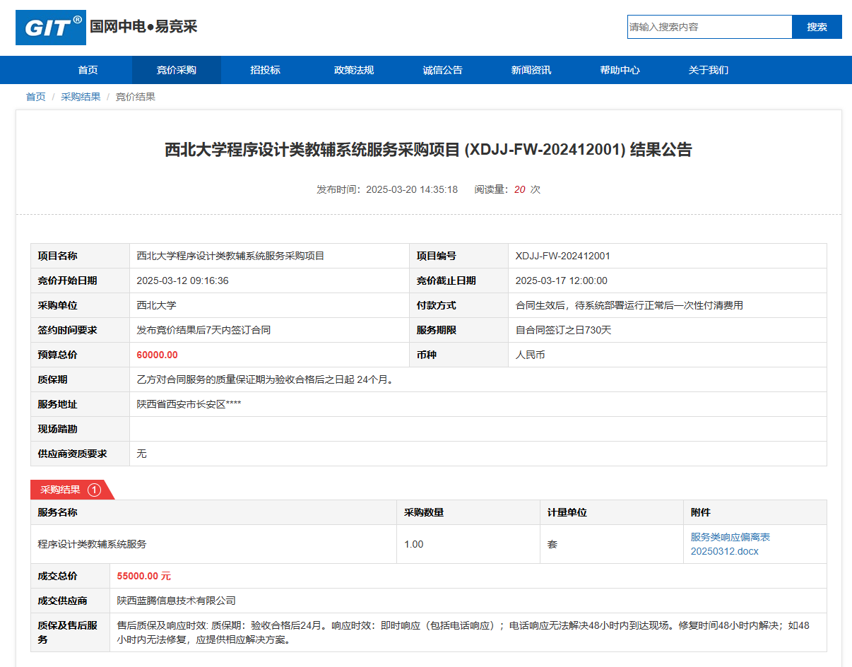 MILAN.COM程序设计类教辅系统服务采购项目(XDJJ-FW-202412001)竞价结果公告 作者:采购与招标办公室 编辑: 时间:2025-03-20 原公告链接:https://www.ejingcai.com.cn/site/bidding/detail/17064
