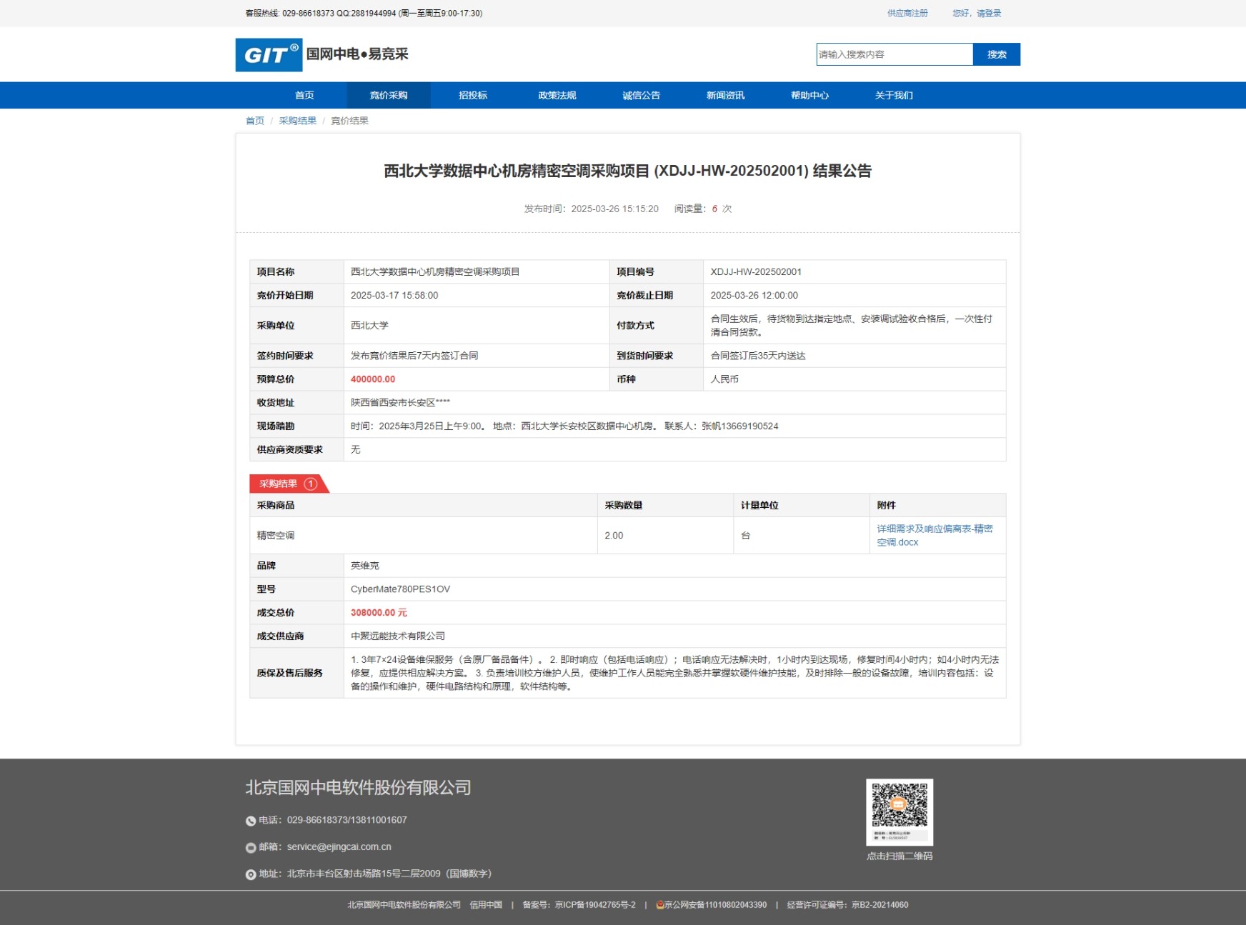 MILAN.COM数据中心机房精密空调采购项目 (XDJJ-HW-202502001)竞价结果公告 作者: 编辑:采购与招标办公室 时间:2025-03-26 原公告链接:https://www.ejingcai.com.cn/site/bidding/detail/17207