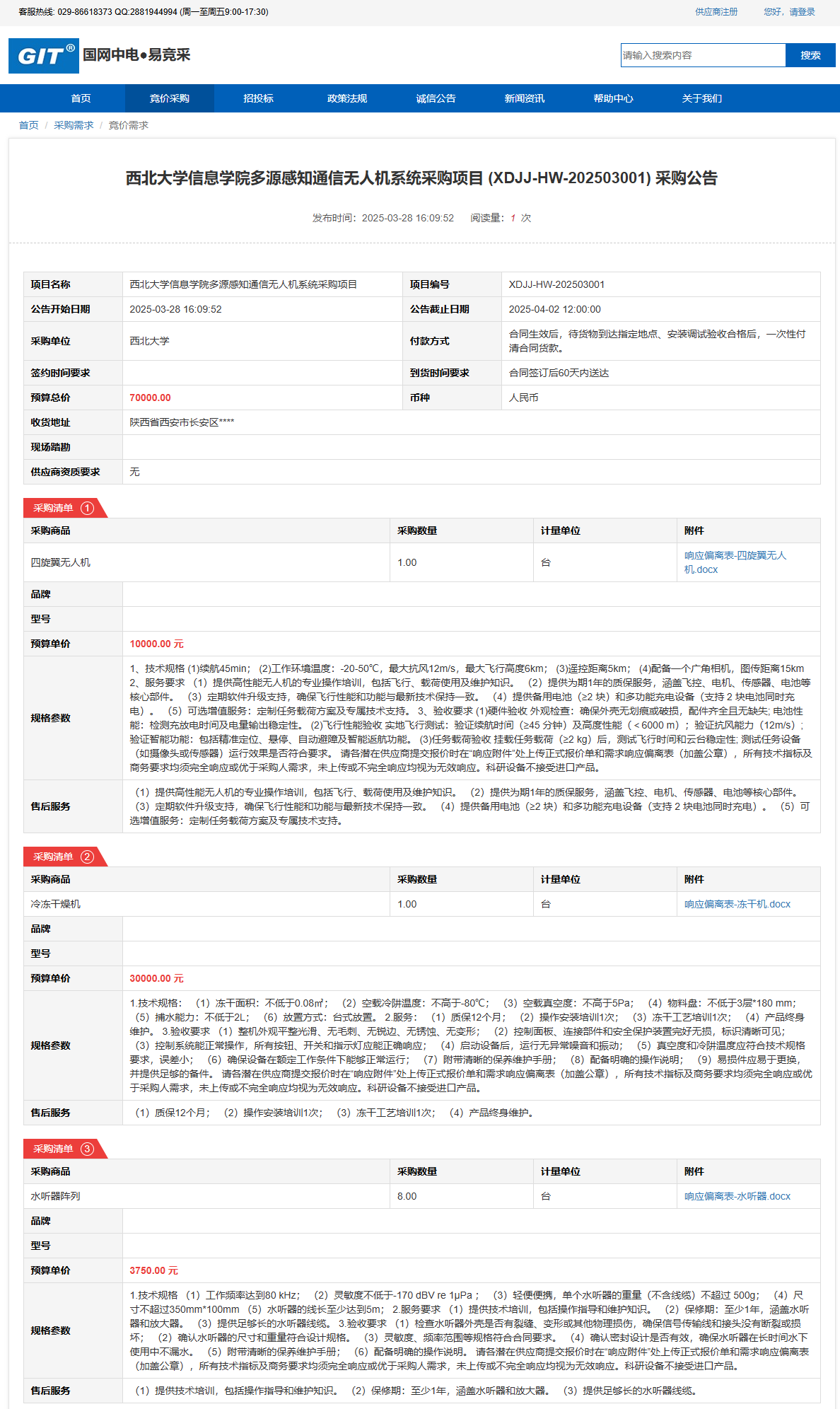 MILAN.COM信息学院多源感知通信无人机系统采购项目(XDJJ-HW-202503001)竞价采购公告 作者:采购与招标办公室 编辑: 时间:2025-03-28 原公告链接:https://www.ejingcai.com.cn/site/bidding/detail/17255
