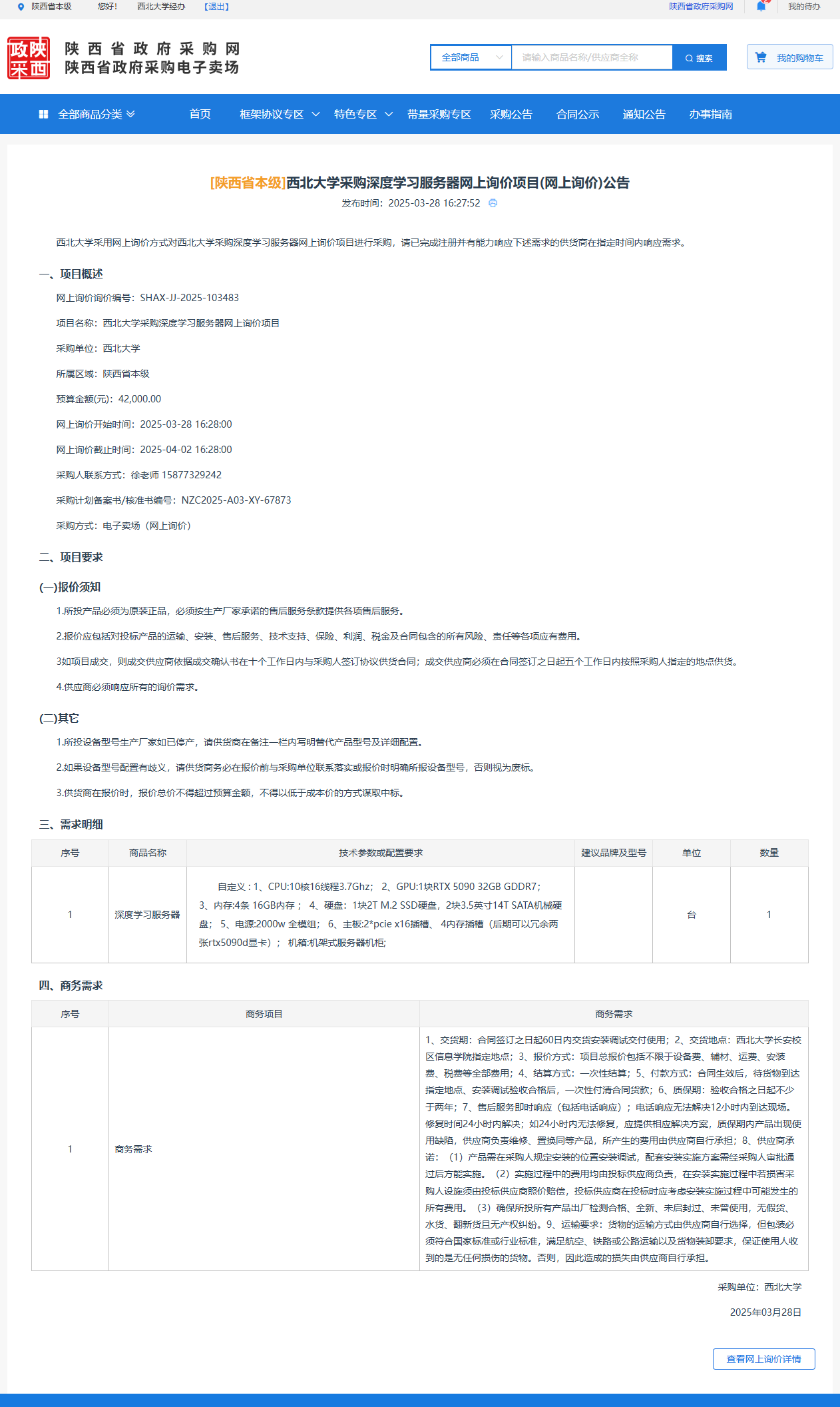 MILAN.COM采购深度学习服务器网上询价项目(网上询价)公告 作者:采购与招标办公室 编辑: 时间:2025-03-28 原公告链接:https://www.ccgp-shaanxi.gov.cn/gpmall-main-web/basic/noticeDetail?noticeGuid=7304685071385165824