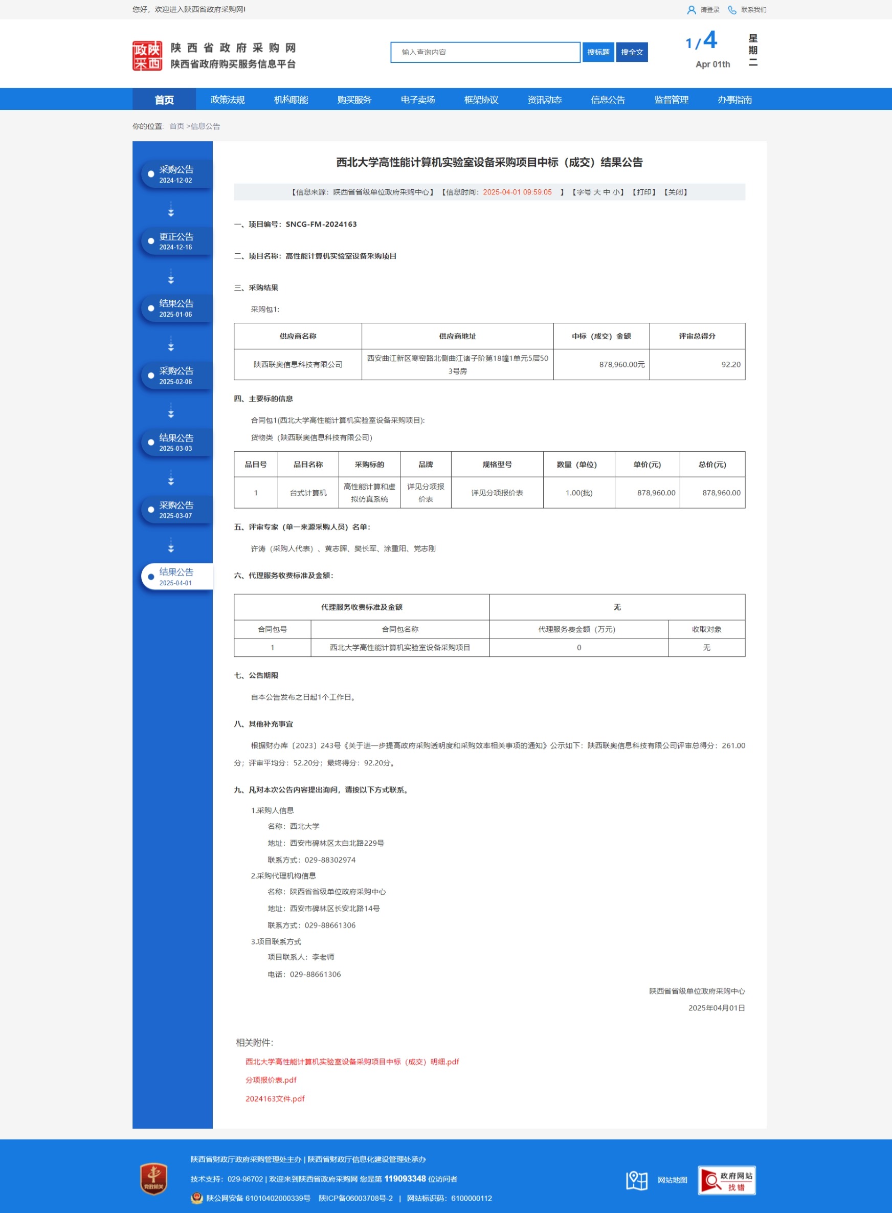 MILAN.COM高性能计算机实验室设备采购项目中标(成交)结果公告 作者: 编辑:采购与招标办公室 时间:2025-04-01 原公告链接:https://www.ccgp-shaanxi.gov.cn/freecms/site/shaanxi/ggxx/info/2025/8a69c0959566cd7e0195eef3776f2f16.html?noticeType=001021¬iceId=b788f147-0e9e-11f0-8063-08c0eb20c666