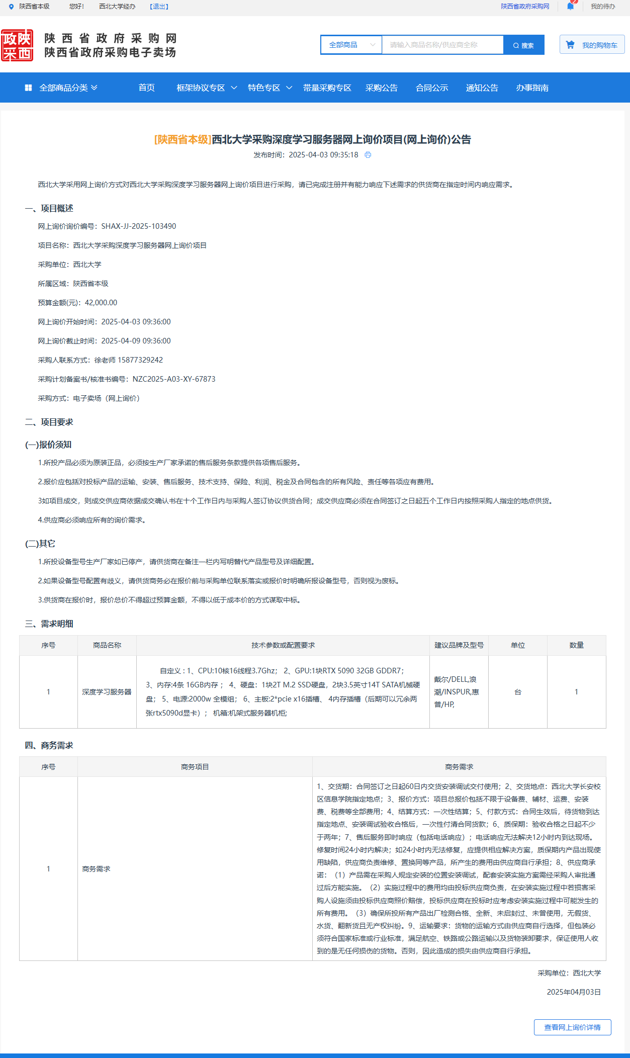 MILAN.COM采购深度学习服务器网上询价项目(网上询价)公告 作者:采购与招标办公室 编辑: 时间:2025-04-03 原公告链接:https://www.ccgp-shaanxi.gov.cn/gpmall-main-web/basic/noticeDetail?noticeGuid=7306755570823004160