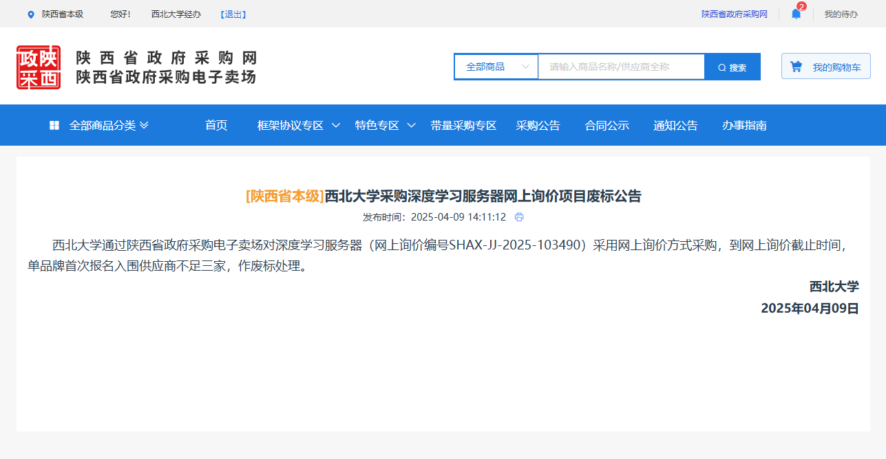 MILAN.COM采购深度学习服务器网上询价项目废标公告 作者:采购与招标办公室 编辑: 时间:2025-04-09 原公告链接:https://www.ccgp-shaanxi.gov.cn/gpmall-main-web/basic/noticeDetail?noticeGuid=7308999329707130880