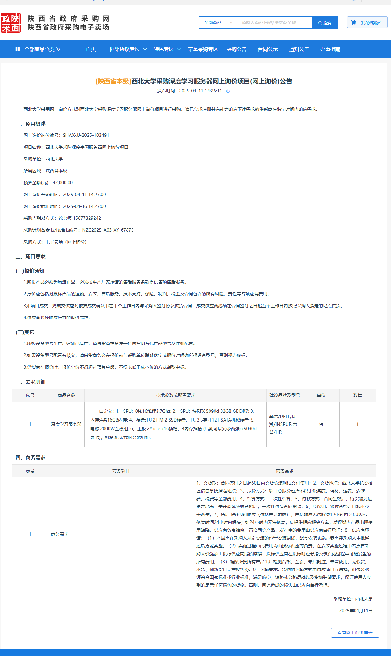 MILAN.COM采购深度学习服务器网上询价项目(网上询价)公告 作者:采购与招标办公室 编辑: 时间:2025-04-11 原公告链接:https://www.ccgp-shaanxi.gov.cn/gpmall-main-web/basic/noticeDetail?noticeGuid=7309727879137525760