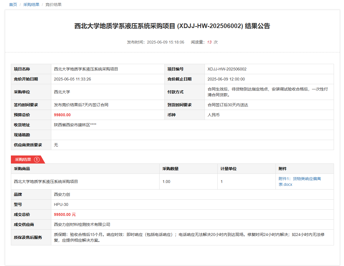 MILAN.COM地质学系液压系统采购项目(XDJJ-HW-202506002)竞价结果公告 作者:采购与招标办公室 编辑: 时间:2025-06-09 原公告链接:https://www.ejingcai.com.cn/site/bidding/detail/18744