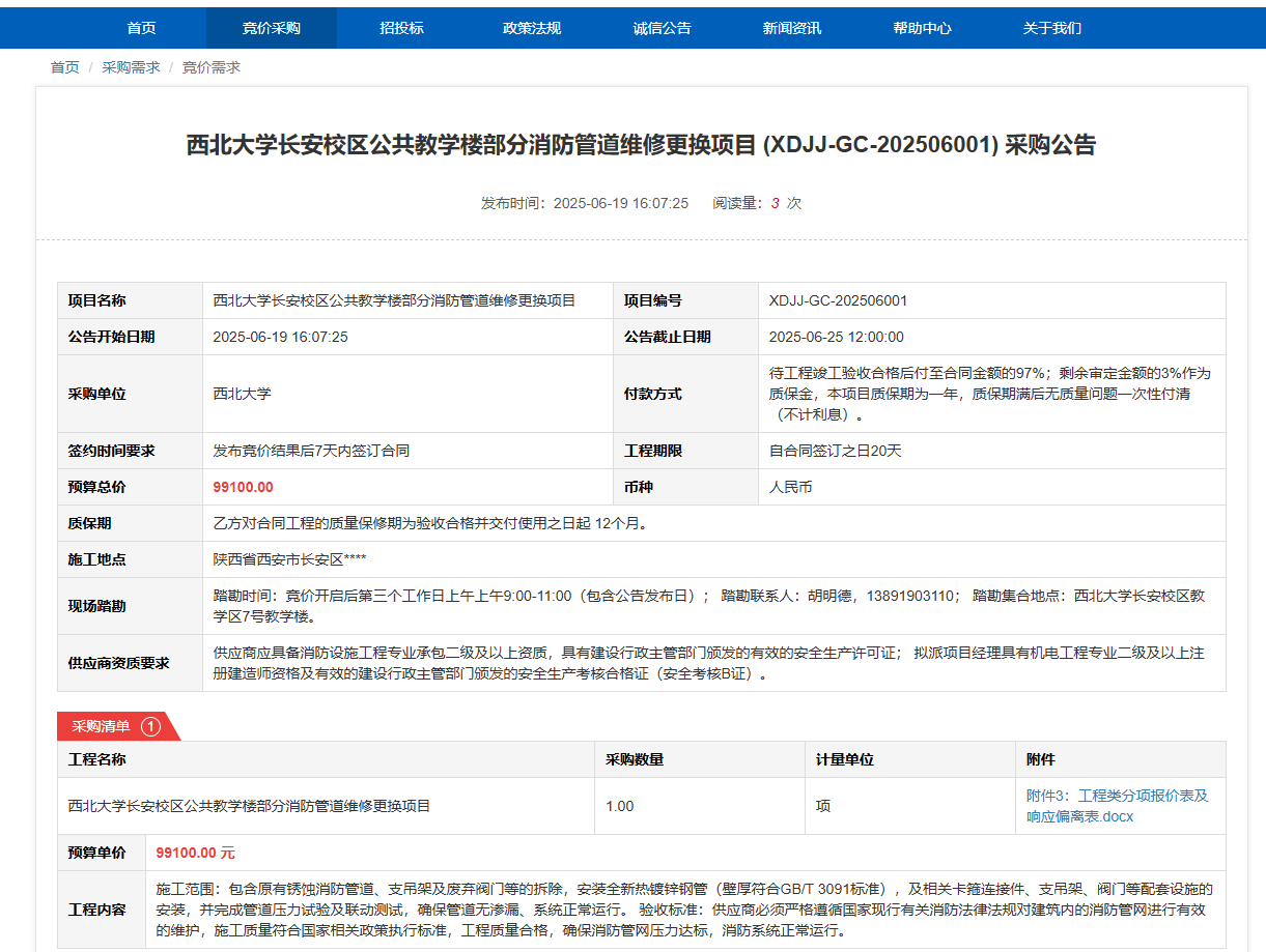 MILAN.COM长安校区公共教学楼部分消防管道维修更换项目(XDJJ-GC-202506001)竞价采购公告 作者:采购与招标办公室 编辑: 时间:2025-06-19 原公告链接:https://www.ejingcai.com.cn/site/bidding/detail/19038