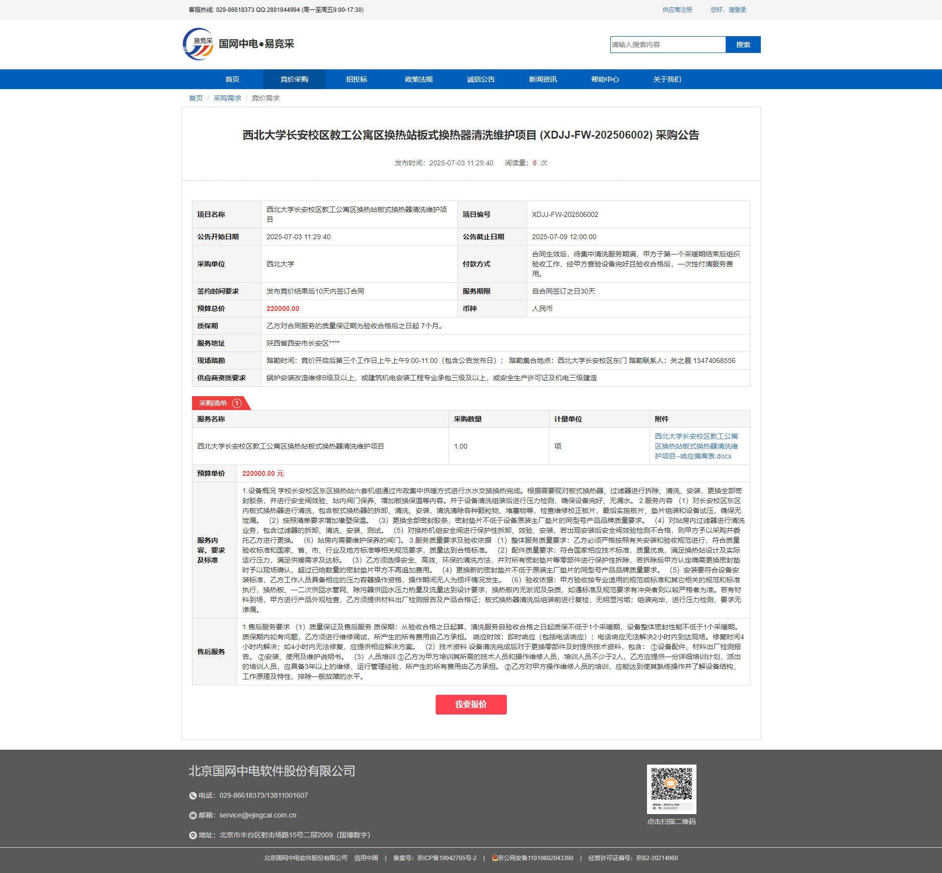 MILAN.COM长安校区教工公寓区换热站板式换热器清洗维护项目 (XDJJ-FW-202506002) 采购公告