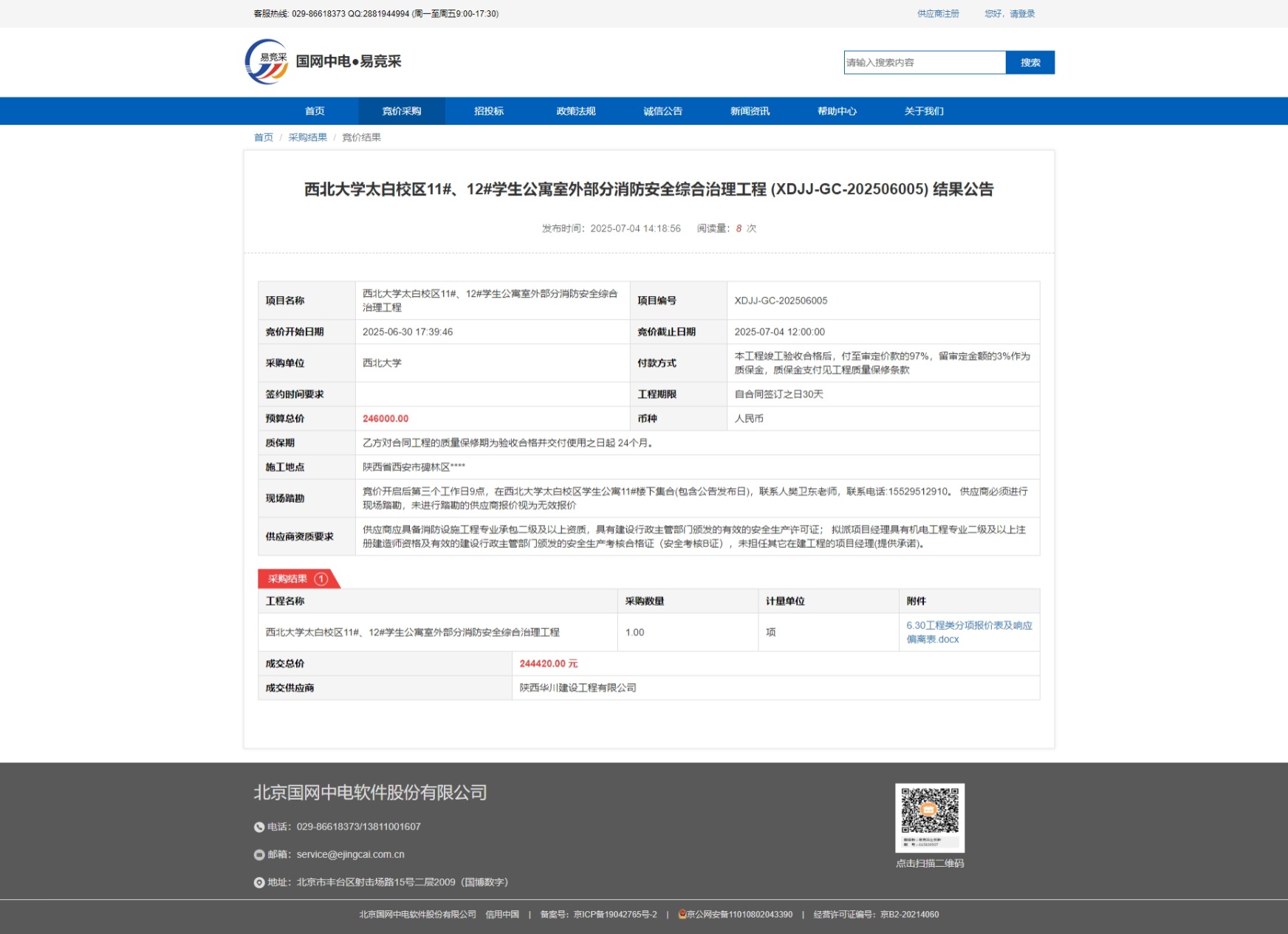 MILAN.COM太白校区11#、12#学生公寓室外部分消防安全综合治理工程 (XDJJ-GC-202506005) 结果公告 作者: 编辑:采购与招标办公室 时间:2025-07-04 原公告链接:https://www.ejingcai.com.cn/site/bidding/detail/19344
