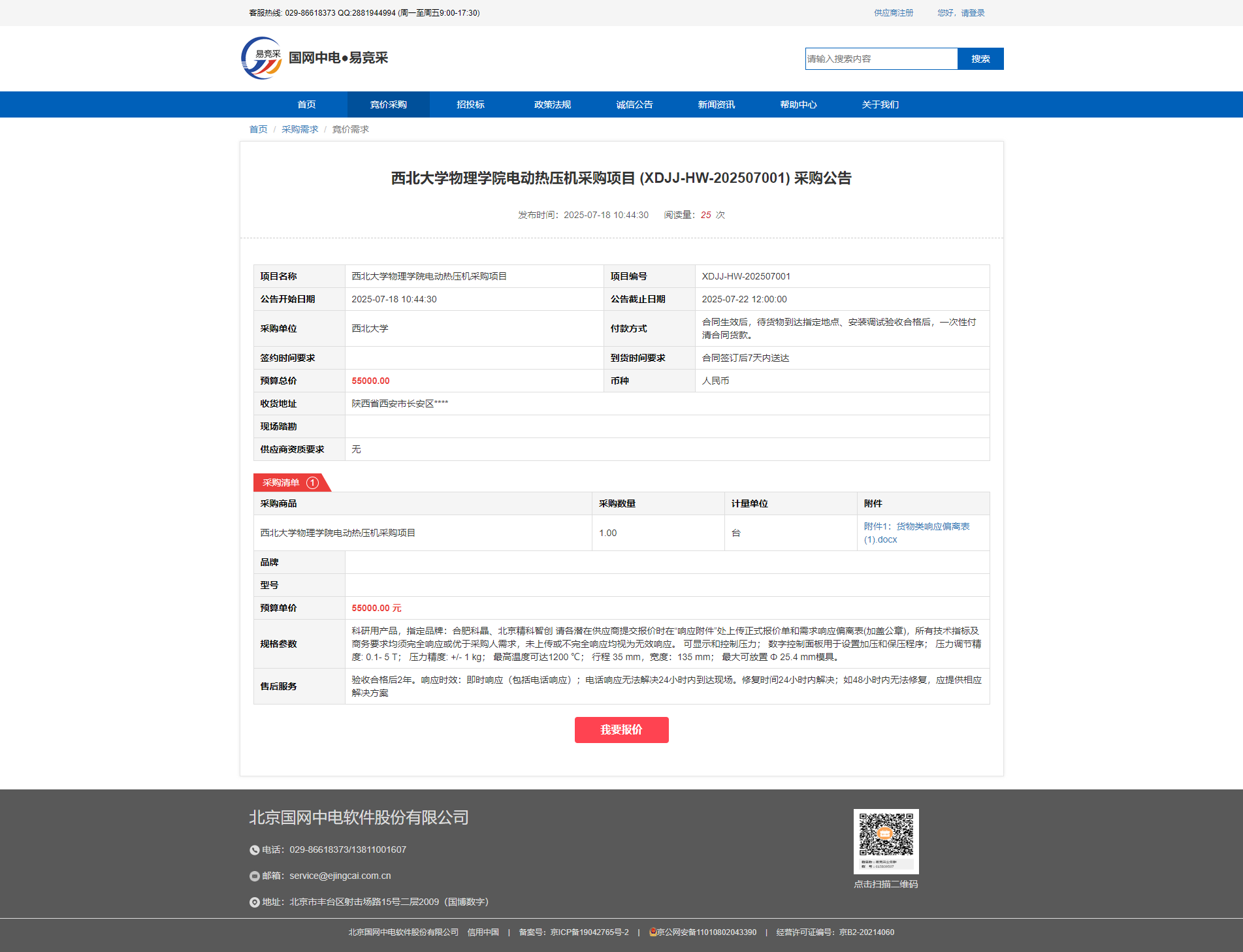 MILAN.COM物理学院电动热压机采购项目(XDJJ-HW-202507001)竞价采购公告