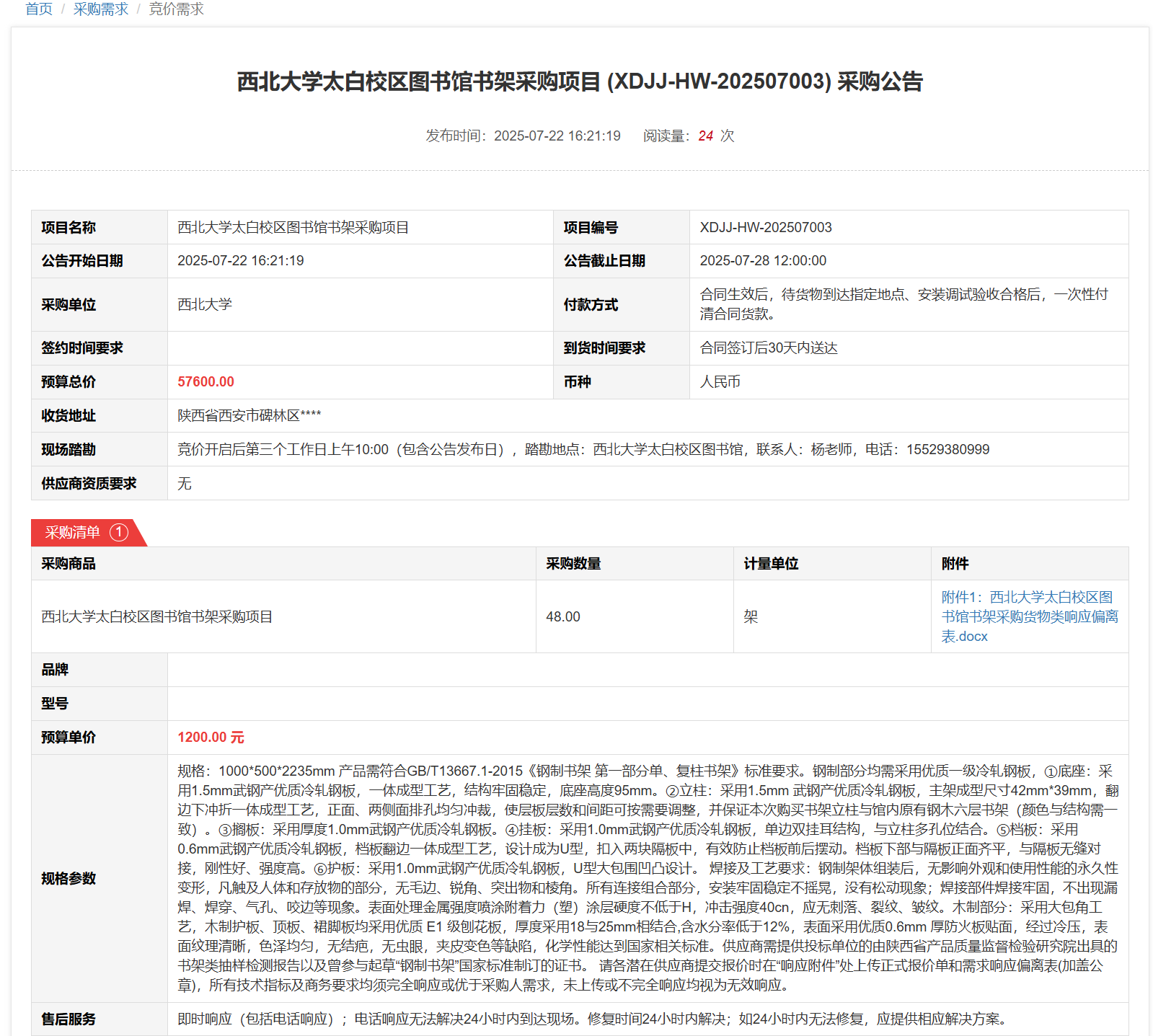 MILAN.COM太白校区图书馆书架采购项目(XDJJ-HW-202507003)竞价采购公告 作者:采购与招标办公室 编辑: 时间:2025-07-22 原公告链接:https://www.ejingcai.com.cn/site/bidding/detail/19666