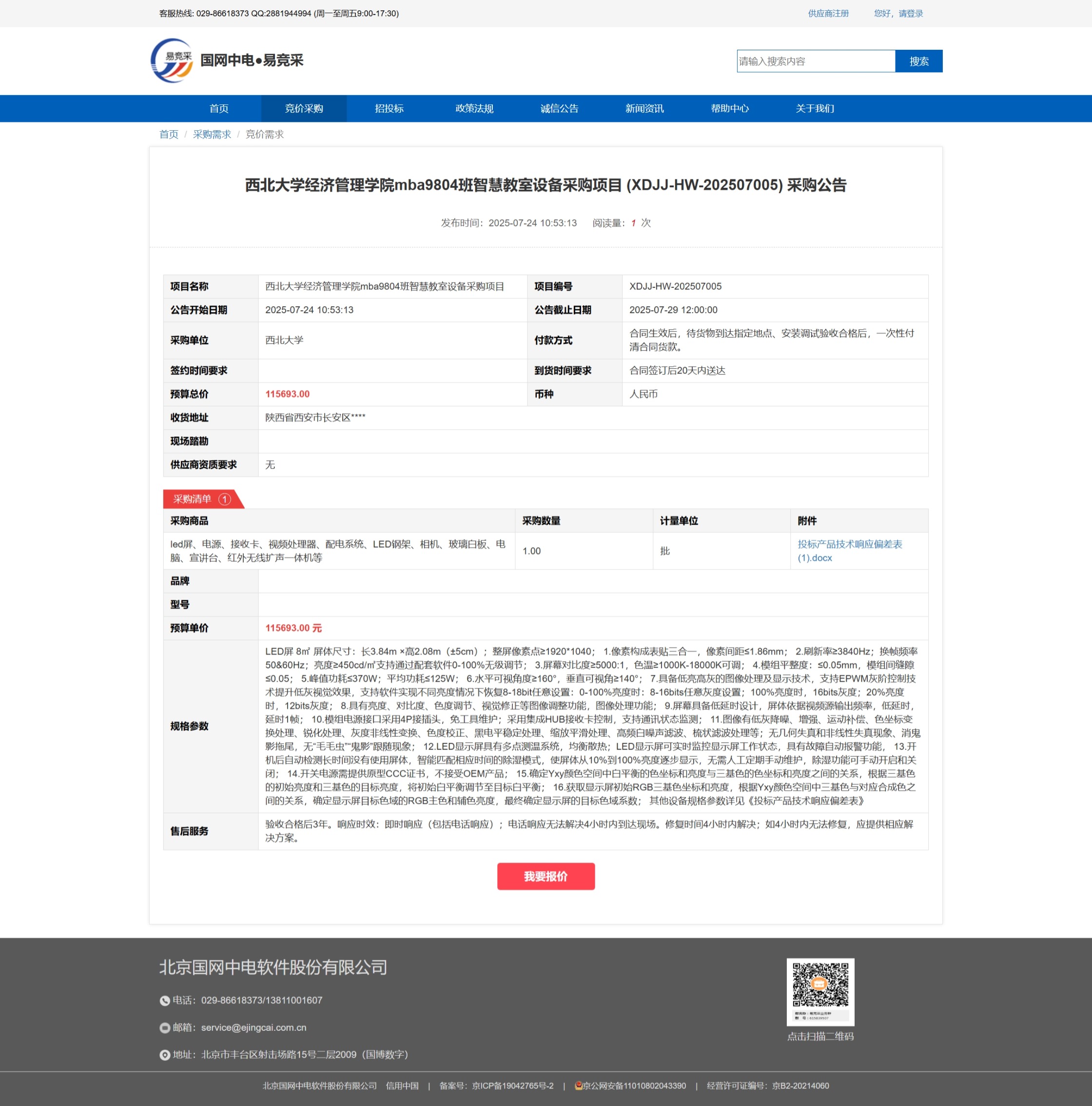MILAN.COM经济管理学院mba9804班智慧教室设备采购项目 (XDJJ-HW-202507005)竞价采购公告 作者: 编辑:薛利娟 时间:2025-07-24 原公告链接:https://www.ejingcai.com.cn/site/bidding/detail/19708
