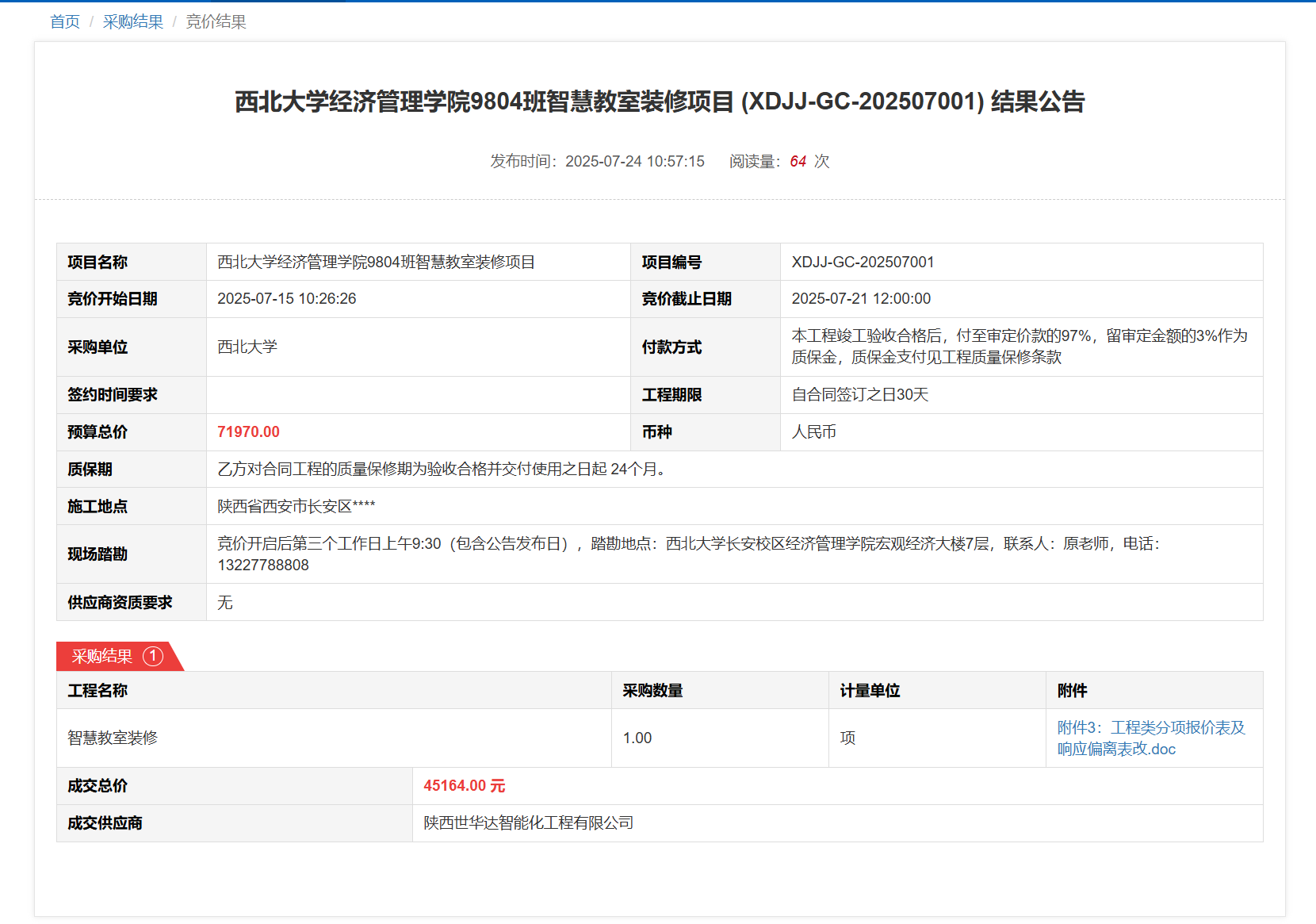 MILAN.COM经济管理学院9804班智慧教室装修项目(XDJJ-GC-202507001)竞价结果公告 作者: 编辑: 时间:2025-07-24 原公告链接:https://www.ejingcai.com.cn/site/bidding/detail/19710