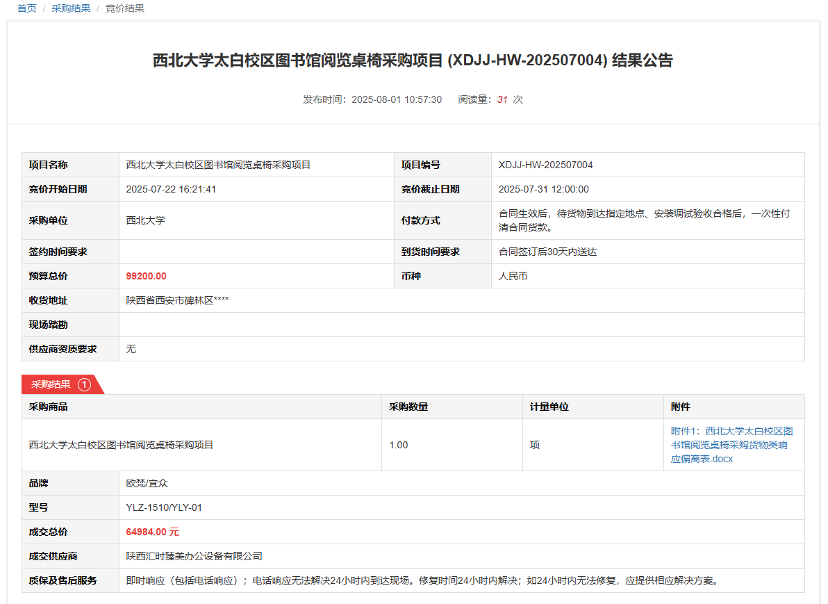 MILAN.COM太白校区图书馆阅览桌椅采购项目(XDJJ-HW-202507004)竞价结果公告