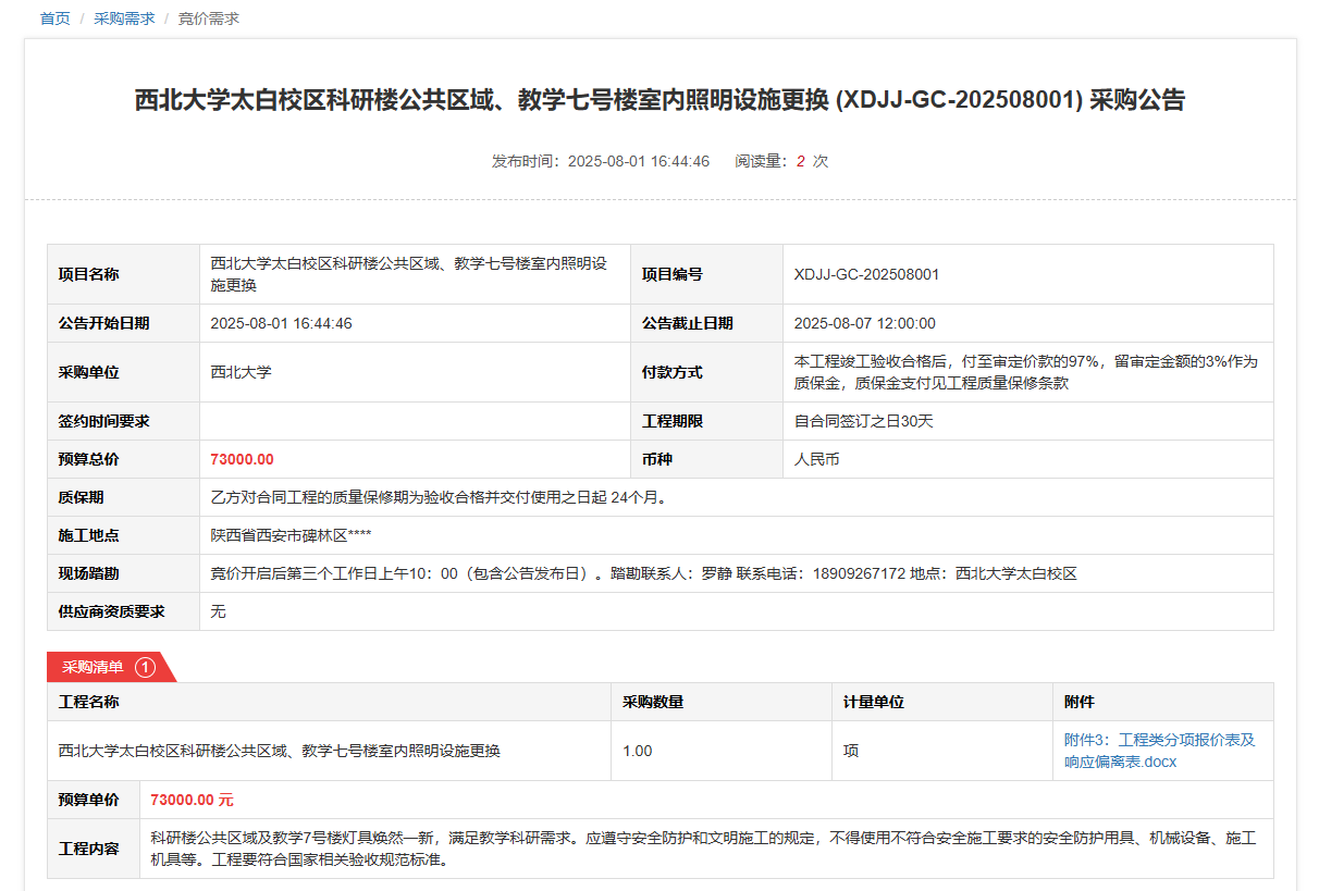 MILAN.COM太白校区科研楼公共区域、教学七号楼室内照明设施更换(XDJJ-GC-202508001)竞价采购公告
