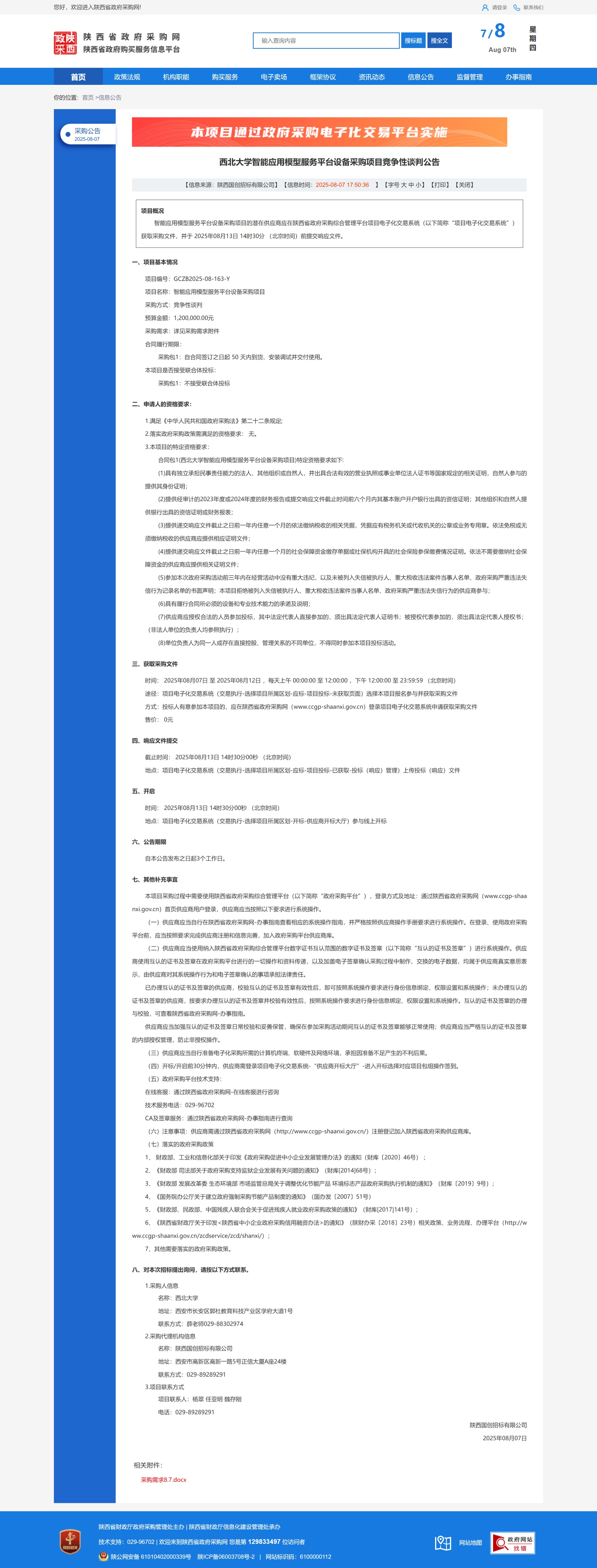 MILAN.COM智能应用模型服务平台设备采购项目竞争性谈判公告 作者: 编辑:薛利娟 时间:2025-08-07 原公告链接:https://www.ccgp-shaanxi.gov.cn/freecms/site/shaanxi/ggxx/info/2025/8a69c1e29860ef6f019883d28fa93451.html?noticeType=001013¬iceId=056ac348-7376-11f0-8063-08c0eb20c666