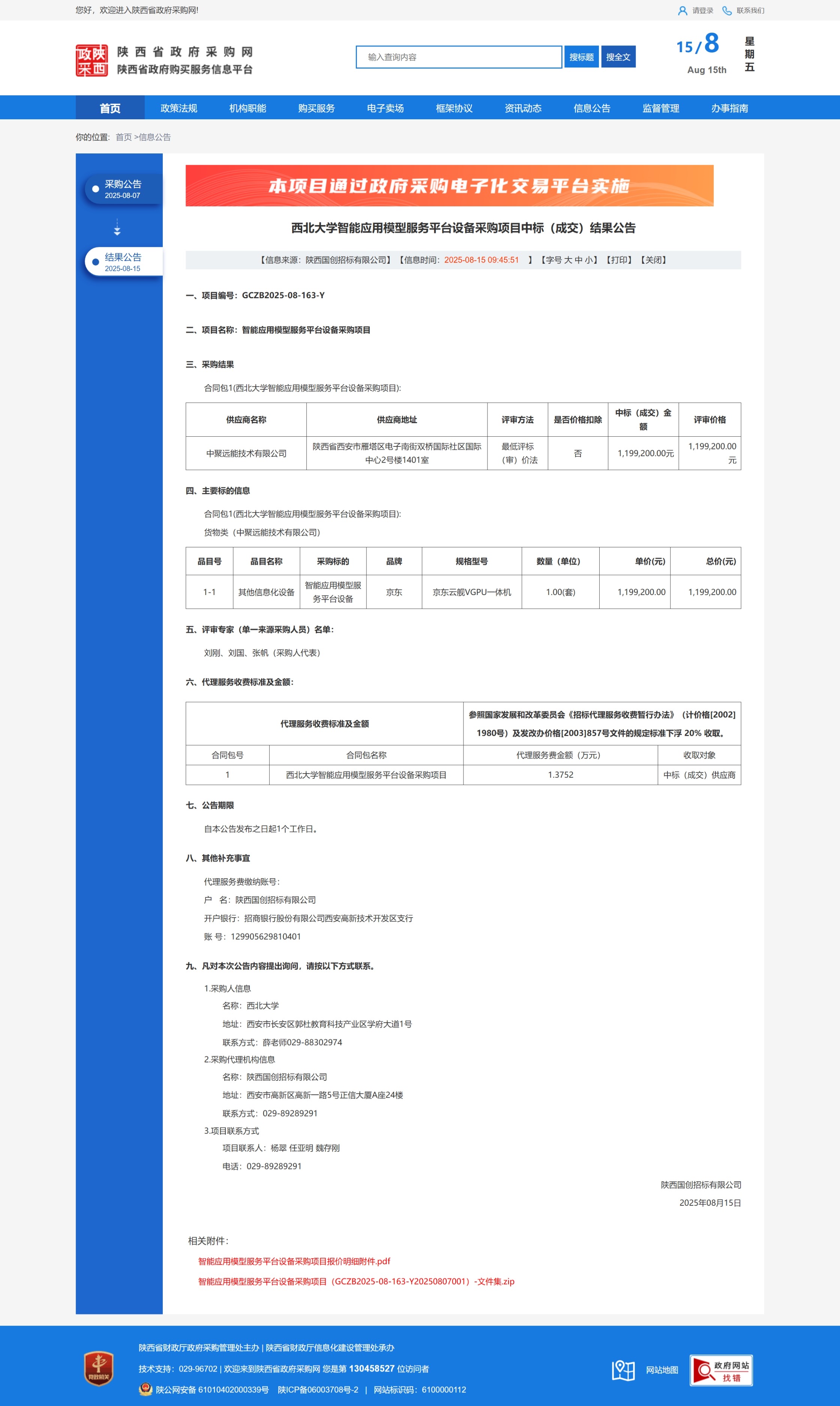 MILAN.COM智能应用模型服务平台设备采购项目中标(成交)结果公告 作者: 编辑:采购与招标办公室 时间:2025-08-15 原公告链接:https://www.ccgp-shaanxi.gov.cn/freecms/site/shaanxi/ggxx/info/2025/8a69c4d59860f6420198ab5332c37fcf.html?noticeType=001023¬iceId=a3a64a26-797b-11f0-8063-08c0eb20c666
