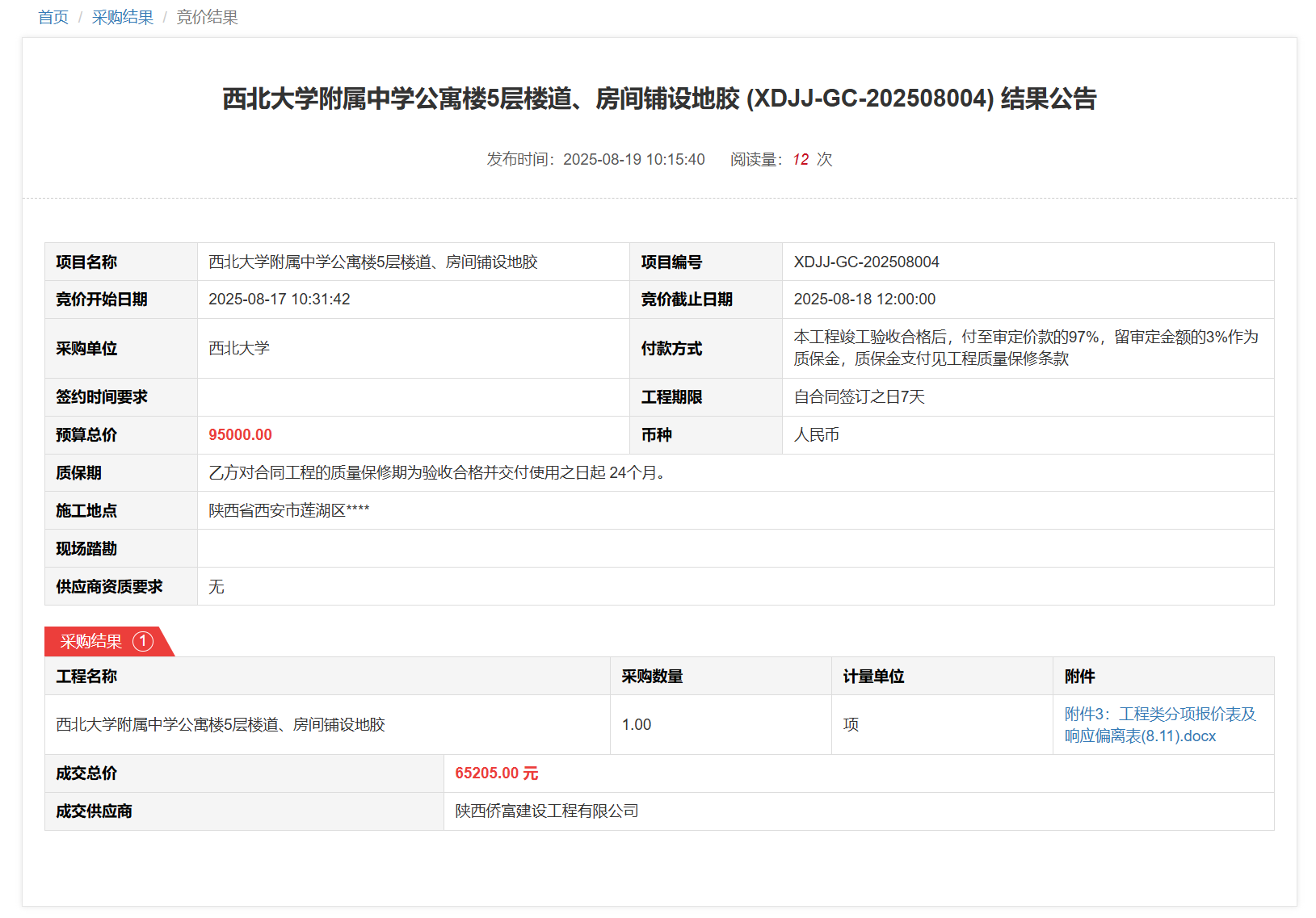 MILAN.COM附属中学公寓楼5层楼道、房间铺设地胶(XDJJ-GC-202508004)竞价结果公告
