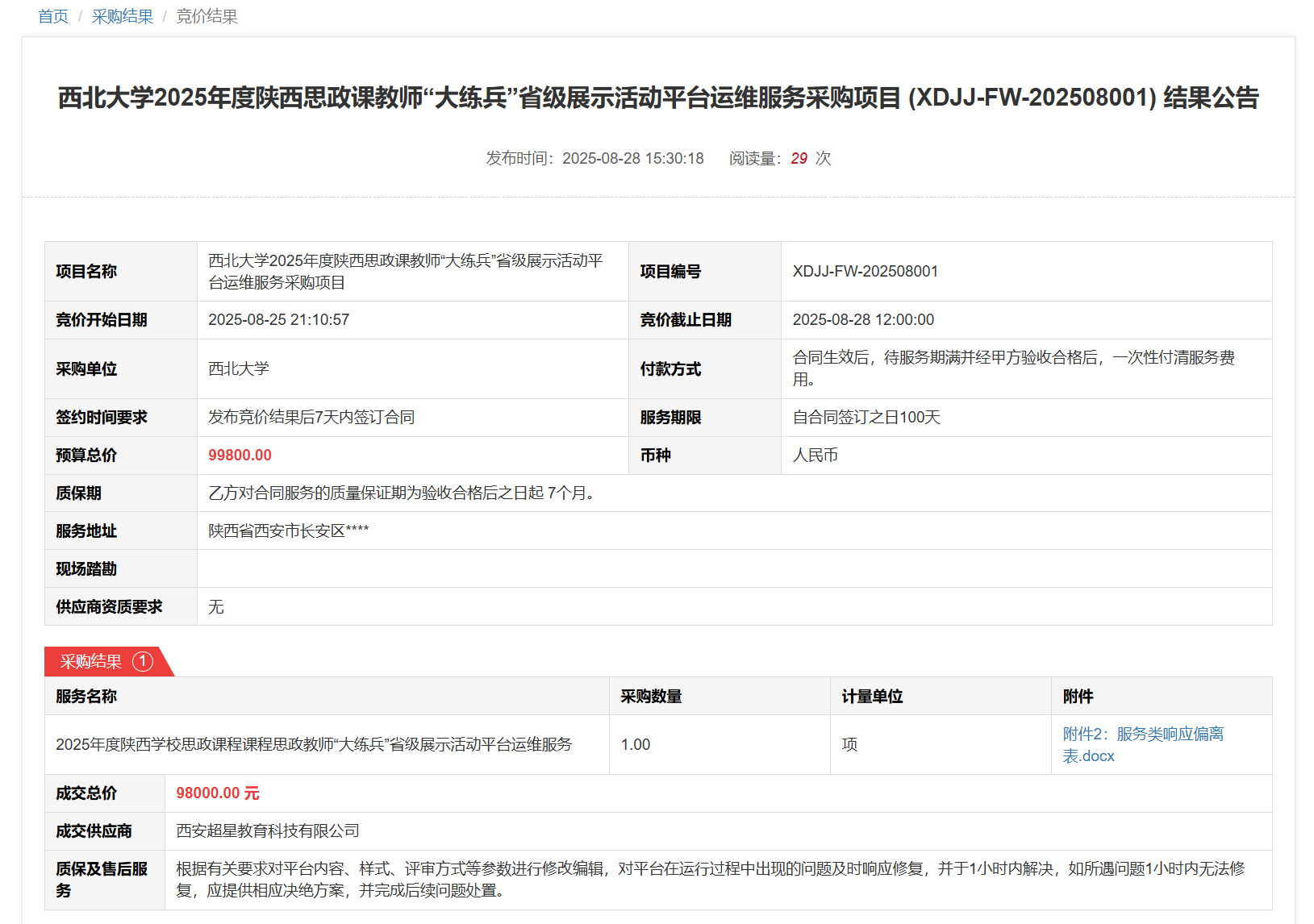 MILAN.COM2025年度陕西思政课教师“大练兵”省级展示活动平台运维服务采购项目(XDJJ-FW-202508001)竞价结果公告 作者:XDJJ-FW-202508001 编辑: 时间:2025-08-28 原公告链接