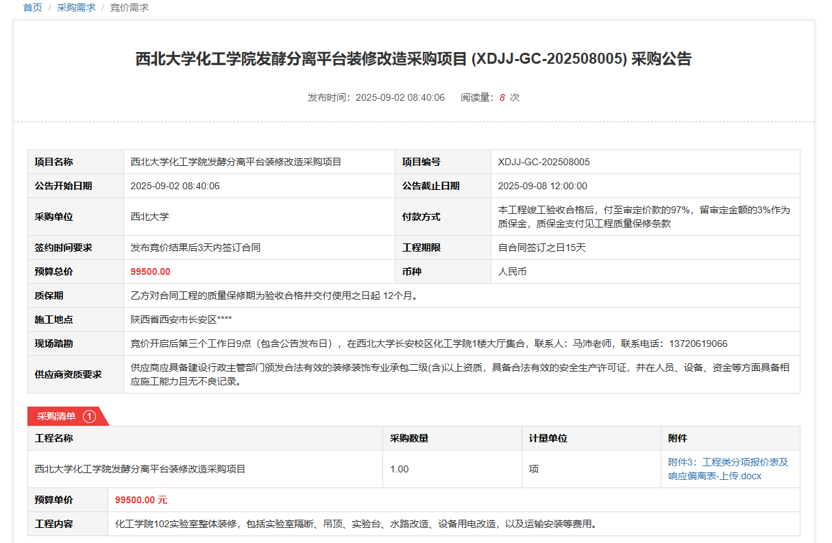 MILAN.COM化工学院发酵分离平台装修改造采购项目(XDJJ-GC-202508005)竞价采购公告