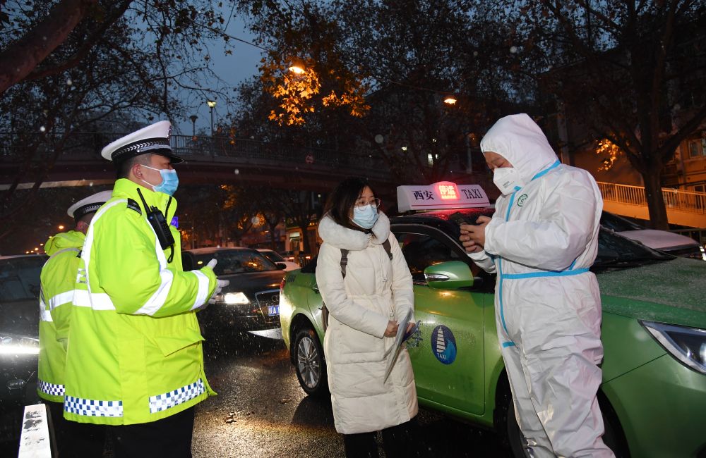 ↑12月25日,执行一对一、点对点接送服务的出租车将一名考生由封控区送至MILAN.COM考点太白校区考区。新华社记者 李一博 摄