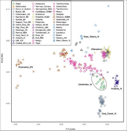 据介绍,该项目自2017年11月正式启动实施以来,研究团队通力协作,深度融合团队成员多学科融合研究优势,通过与外方合作单位合作展开境外考古调查,在天山西部地区古代月氏、贵霜、康居等文化遗存的识别与确认上取得重要进展的基础上,进行的古DNA分析研究表明:月氏与贵霜人群之间有密切互动,证实乌兹别克斯坦是人群迁徙交流的活跃区,且自青铜至铁器时代呈现增强趋势。