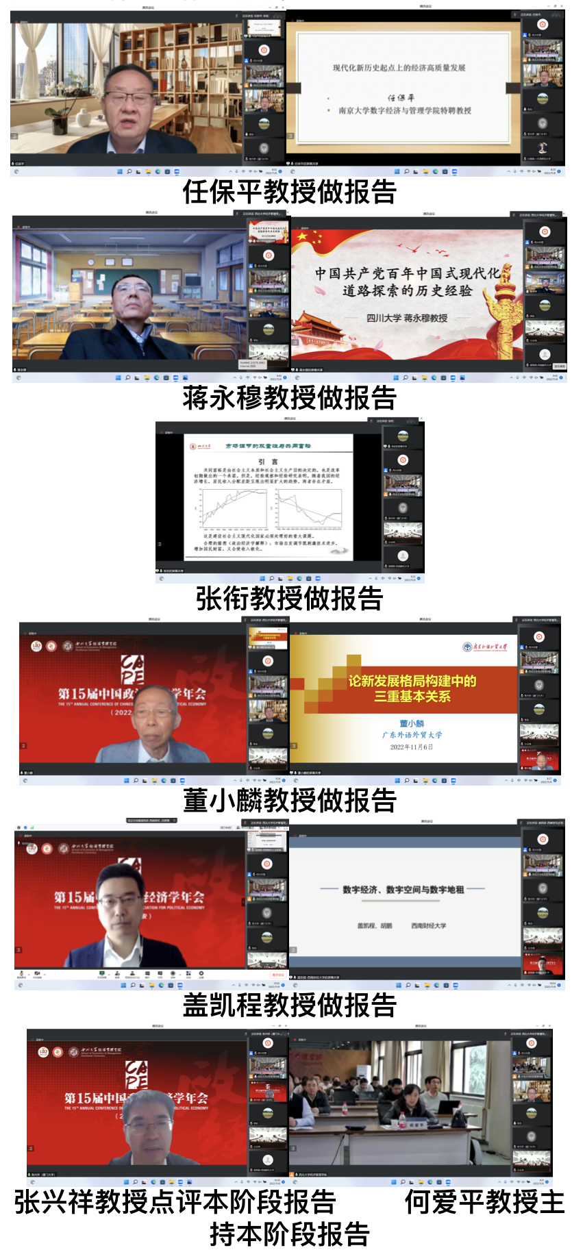 11月6日上午,年会举行主题报告及闭幕式。上半场主题报告上,南京大学数字经济与管理学院任保平教授以《现代化新历史起点上的经济高质量发展》为题、四川大学经济学院院长蒋永穆教授以《中国共产党百年中国式现代化道路探索的历史经验》为题、四川大学经济学院张衔教授以《市场调解的双重性与共同富裕》为题、广东外语外贸大学原副校长董小麟教授以《论新发展格局构建中的三重基本关系》为题、西南财经大学经济学院院长盖凯程教授以《数字经济、数字空间与数字地租》为题作了精彩报告,厦门大学张兴祥教授作了点评。