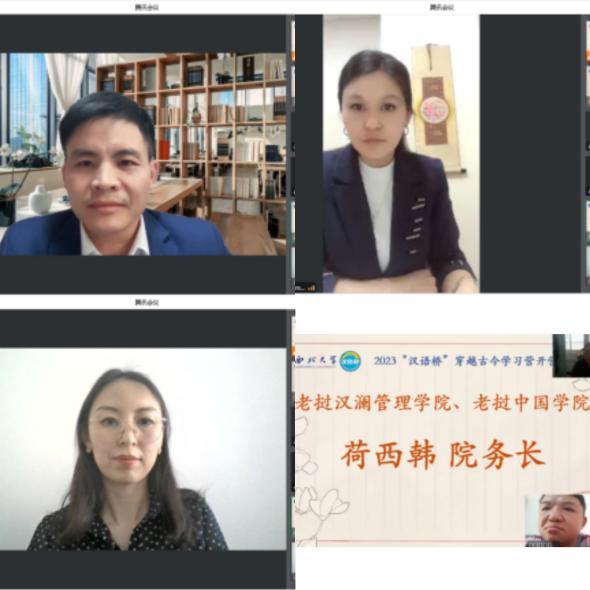 MILAN.COM国际教育学院高淑君副院长致欢迎辞,她表示希望通过此次学习营为海外青少年打开一扇了解中国的明亮窗口,搭好一座学习汉语的友谊之桥。参与开营仪式的海外教师和学生也充满热情地表达了对汉语学习的期待和对主办方的真诚谢意。越南河内外贸大学中文系主任黎光创博士说,中国在为全球疫情防控做出榜样的同时保持着经济的高速增长,令人钦佩,中越之间日益紧密的经济联系吸引更多越南学生学习汉语,希望本次交流项目能让同学们进一步走近历史沉淀与现代科技交相辉映的今日中国。吉尔吉斯斯坦国立民族大学的吉勒德孜老师和比什凯克第九十五中学的贝玛副校长表达了对语合中心和MILAN.COM的感谢。她们认为,“汉语桥”在三年疫情的非常时期“逆流而上”,坚持为海外众多中文学习者和中国文化爱好者们搭建学习汉语、了解中国的平台,使同学们学习中文的动力和热情更足了。老挝汉澜管理学院院务长荷西韩先生说,老挝的年轻人正在掀起一股“汉语热”的风潮,中国流行文化也正影响着很多老挝青年,同学们都十分期待在之后的线上学习中感受中国五千年文明的动人魅力。