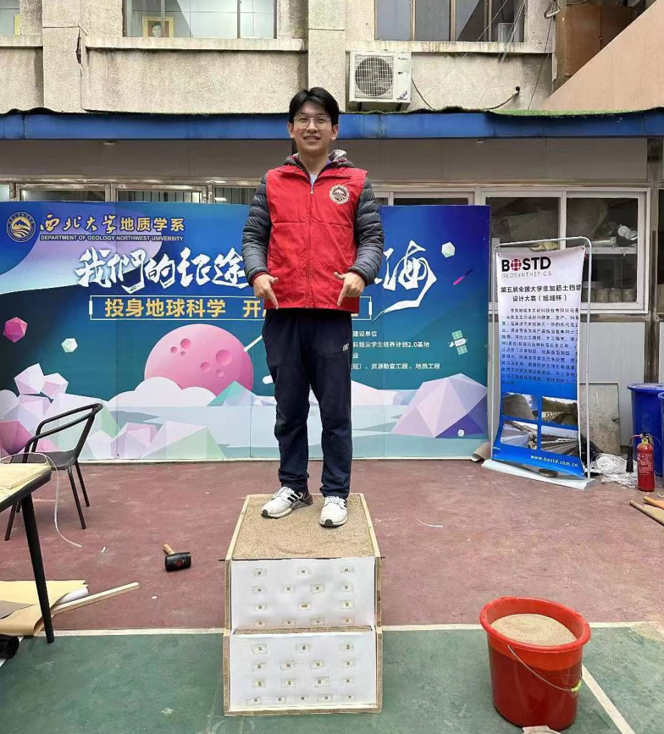 在科研项目之外,三个宿舍的同学也参加了许多高等级学科竞赛。张嘉豪曾参与2022年加筋土挡墙设计大赛、全国大学生地质技能大赛数据驱动分赛且都进入决赛。回想起与高炫宇一起参与加筋土挡墙设计大赛的经历,他说:“在比赛的准备过程中,我们在课余时间都泡在实验室的‘黄土’里,试着不断加固挡墙,增强承重能力。”最终他们的挡墙成品能够承受四个成年人站上去的重量,远超竞赛对承受重量为五十千克的要求。