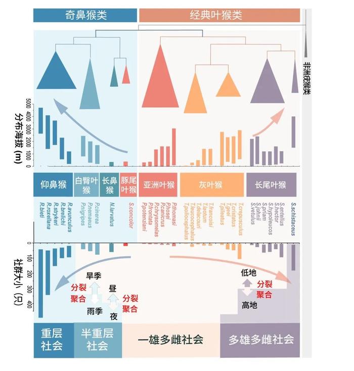 ▲亚洲叶猴类各属的系统发育关系、分布海拔与社会结构(供图:齐晓光 赵兰 武进伟)